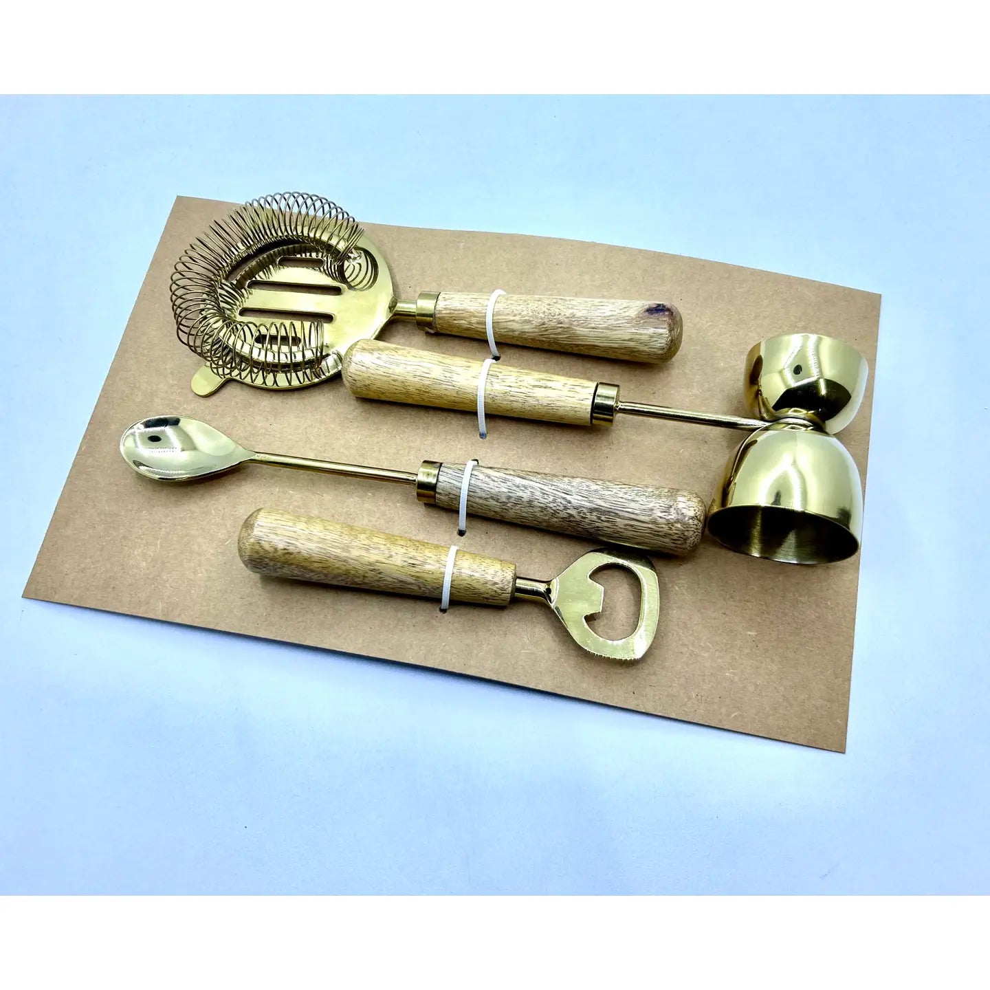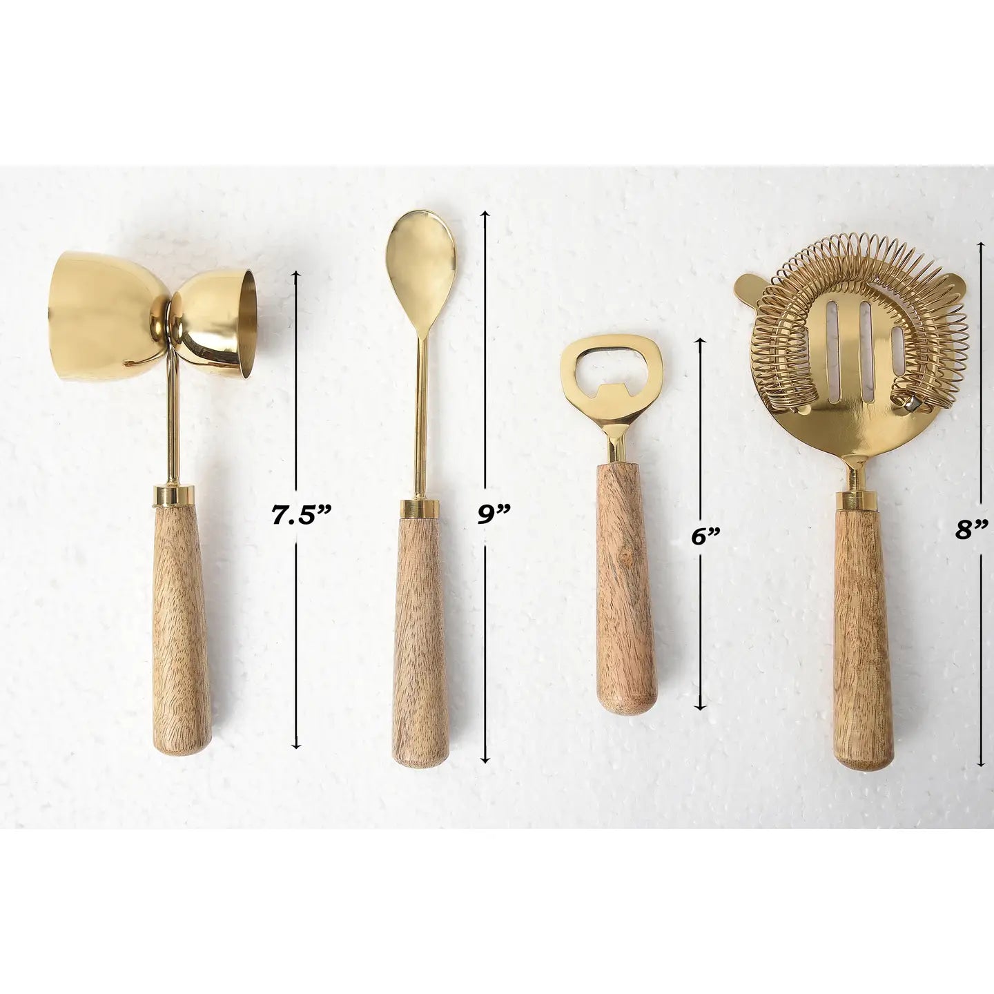 This Bar Set includes an opener, jigger , spoon and strainer