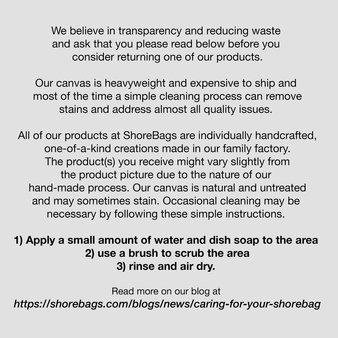 Each bag is an individually handcrafted, one-of-a-kind creation made in a family factory. they may vary slightly from the product picture due to the nature of the handmade process. The canvas is natural and untreated.
