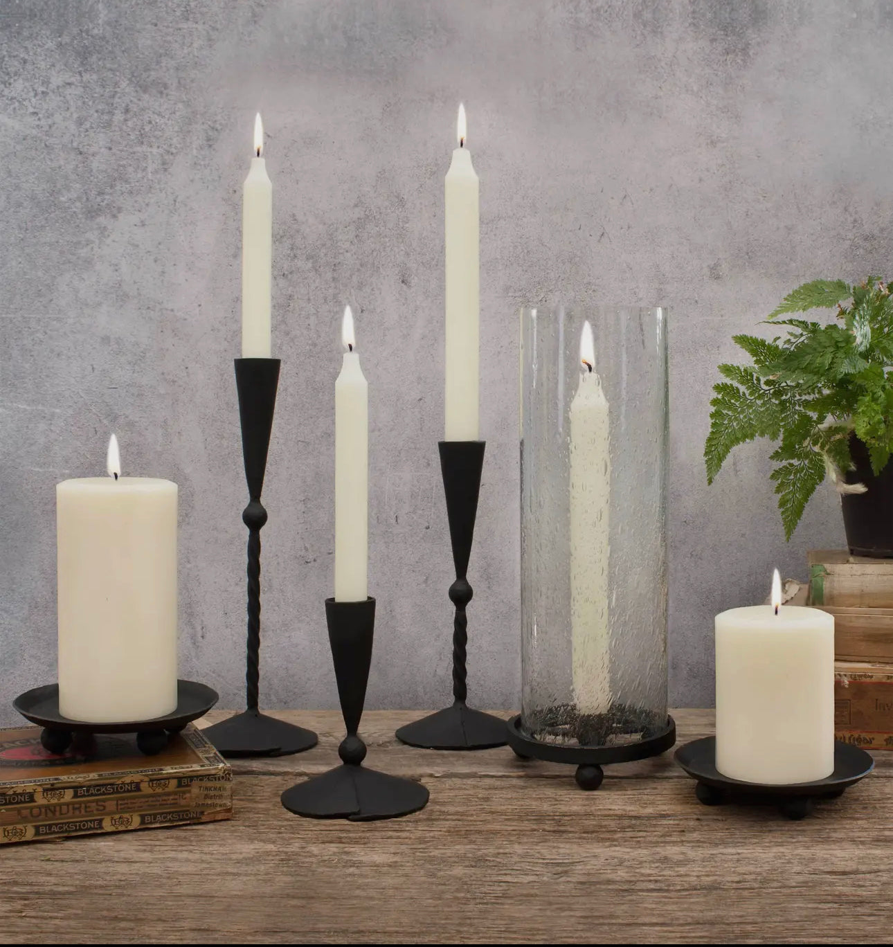 Made of hand-forged wrought iron, the Blacksmith Taper is oil-rubbed to create a deep matte black finish. These charismatic, rustic accessories create a unique ambiance of warmth and comfort in any home decor.