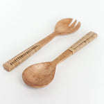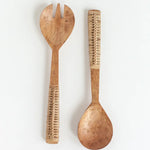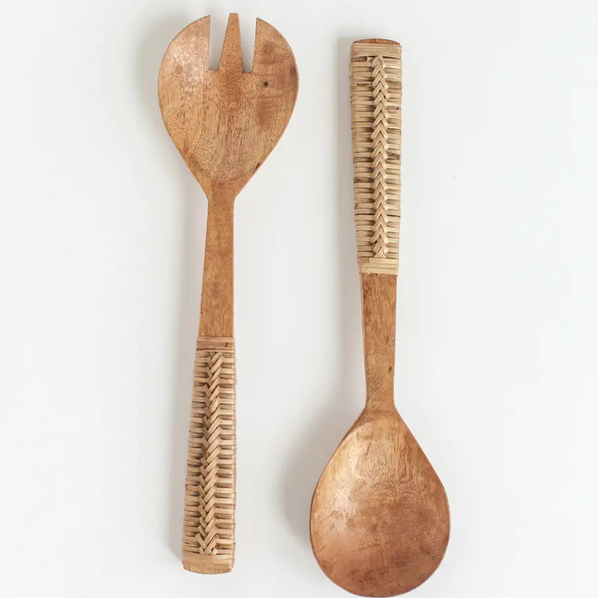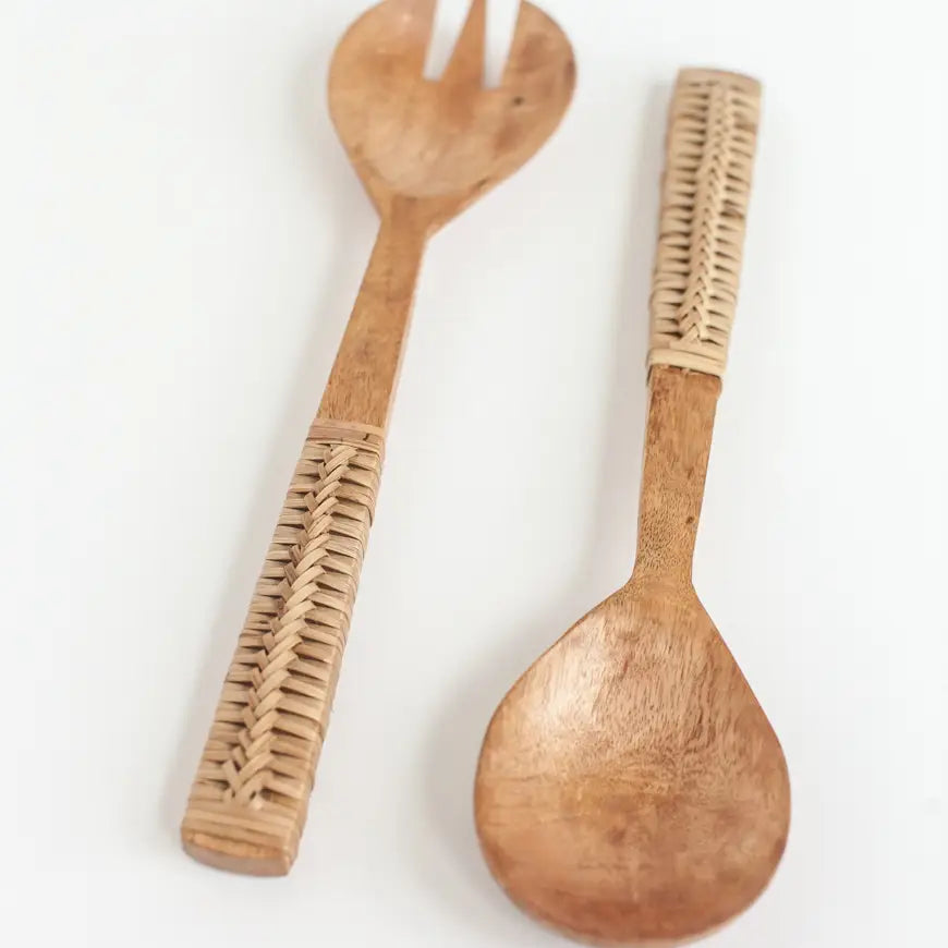 These serving spoons are a testament to sophistication and sustainability. Masterfully crafted in India, they combine beautifully grained mango wood with the rich texture of braided rattan. Each is ethically hand-carved from FSC-certified wood for a product that honors both people and the planet.