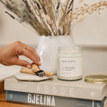 Hand poured into elegant straight-sided clear glass jars with modern minimalist labels. Perfect next to a bud vase filled with freshly picked blooms or your prettiest succulent on a mantle, nightstand, or coffee table. The brushed gold lids instantly make your candle travel-friendly. This candle burns up to 50 hours.