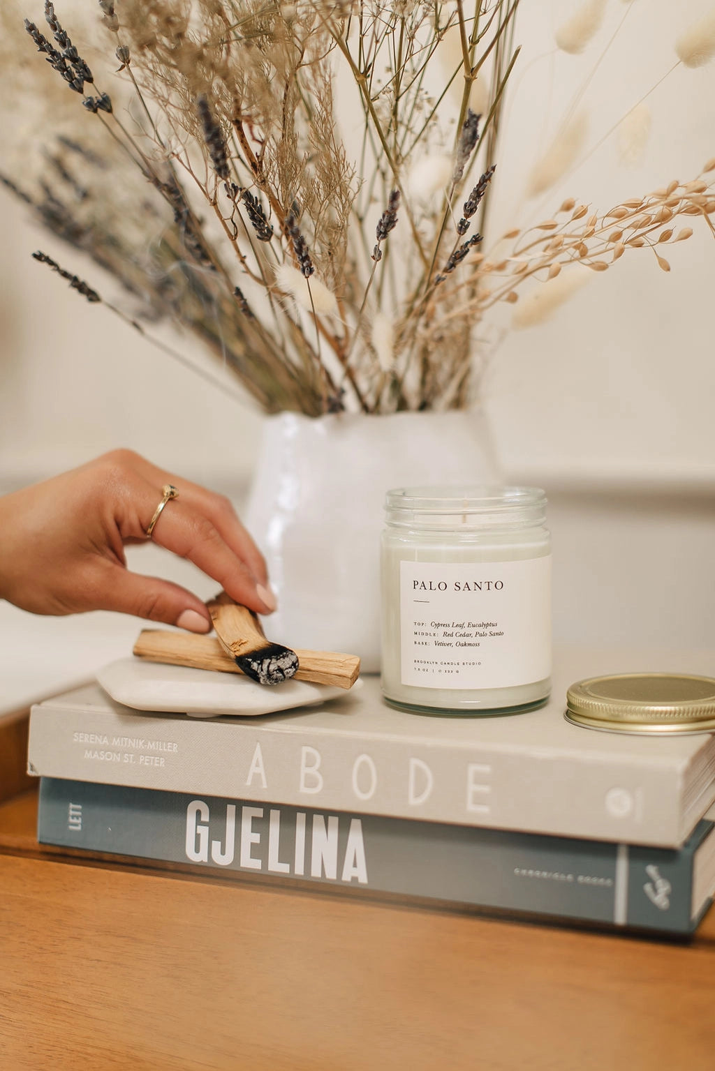 Palo Santo: Since the Incan era, the fragrant wood has been ritualistically burned to cleanse a space of bad energy, and the oil is said to have purifying and healing properties. Our rendition features calming top notes of cedar and mint, middle notes of cypress, and eucalyptus, and warm base notes of sandalwood and amber. This candle is infused with eucalyptus, peppermint, and cedarwood essential oils.