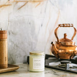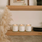 Elegant straight sided clear glass jars with modern minimalist labels. Perfect next to a bud vase filled with freshly picked blooms or your prettiest succulent on a mantle, nightstand, or coffee table. The brushed gold lids instantly make your candle travel-friendly.