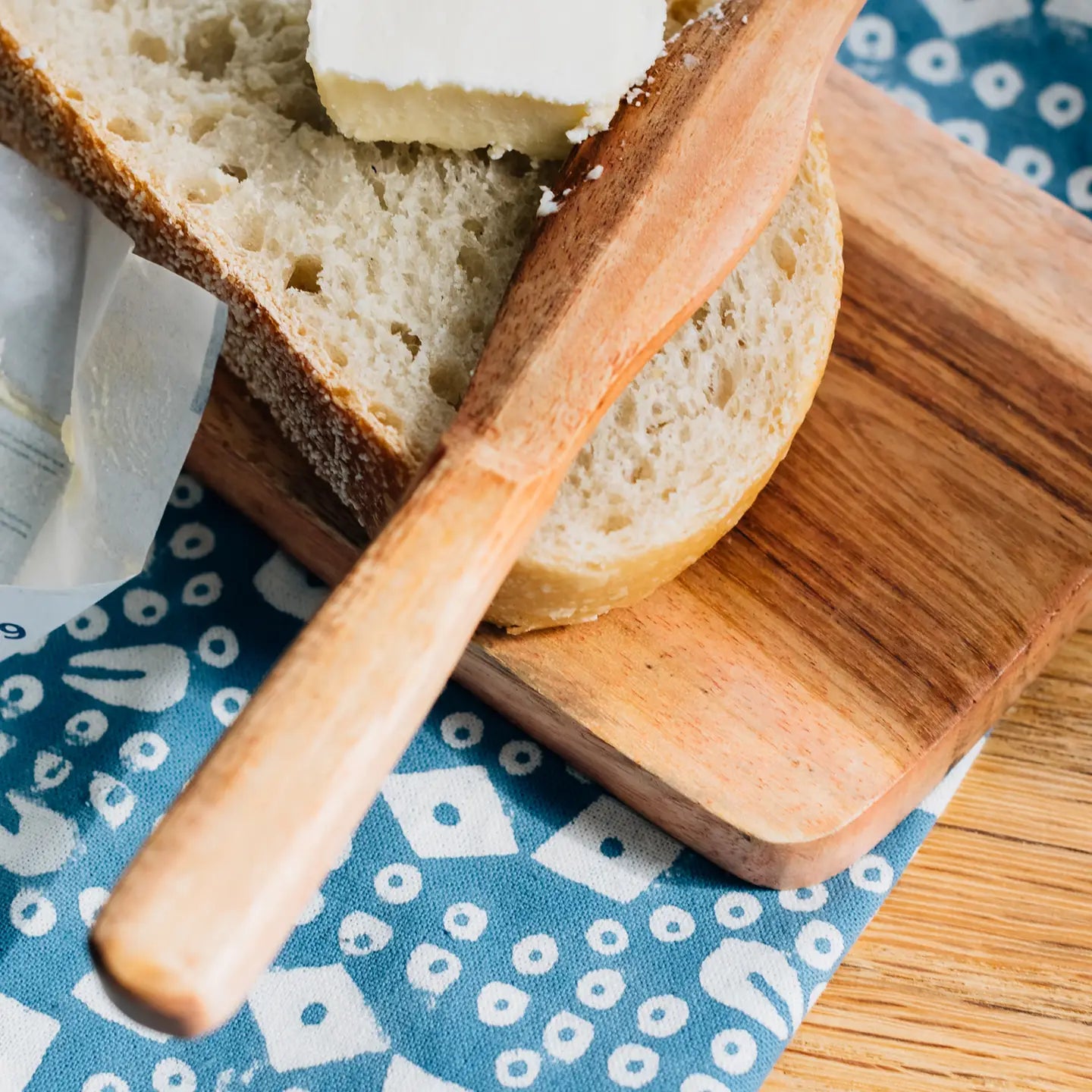 The Charcuterie & Cheese Board features an Acacia wood serving board and cheese knife. This rustic serving set is handcrafted by artisans working with Sasha Exports. This Fair Trade partner helps textile makers earn sustainable incomes and preserve their traditional craft skills through access to new markets.