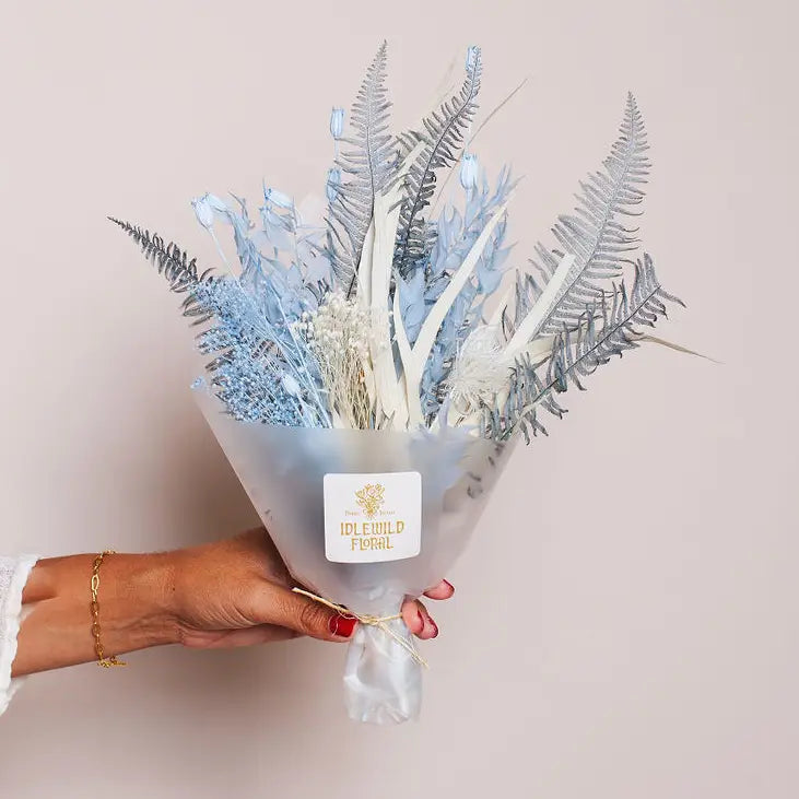 Dried flowers to last a lifetime. A mini dried flower bouquet in soft blue & cream tones. Specific flower types may vary.