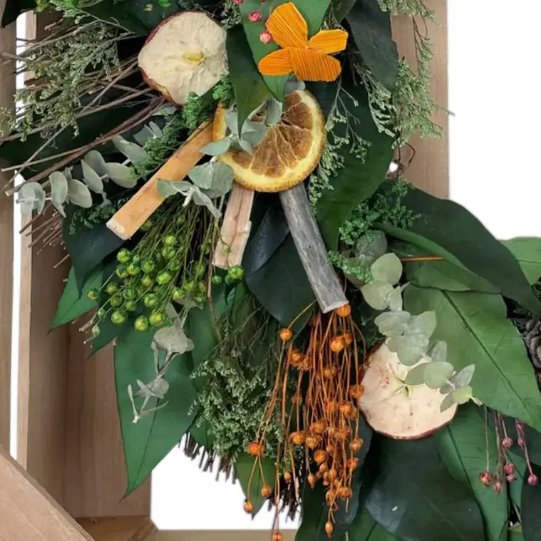 This rustic, handmade fall wreath is crafted using natural materials such as dried orange slices, apple slices, eucalyptus, pinecones, and more. With a green leaf base, this versatile wreath can complement various styles and is perfect for the fall season.