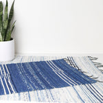 The finishing touch to any space. Crafted using natural dyed indigo and up-cycled organic cotton. Each rug is one of a kind and is to be considered a work of art, equally beautiful and durable. Ideal as an accent scatter rug anywhere in your home or featured as a beautiful wall hanging, or even a table runner.
