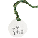 Leaf handmade paper circles with full deckled rounds. Black letterpress printed illustration of an arrangement of flowers and fruit in a vessel. Finished with botanically dyed silk ribbon loops in persimmon. Available as singles or sets of three. Perfect for thoughtful holiday gifts or to hang on your tree!