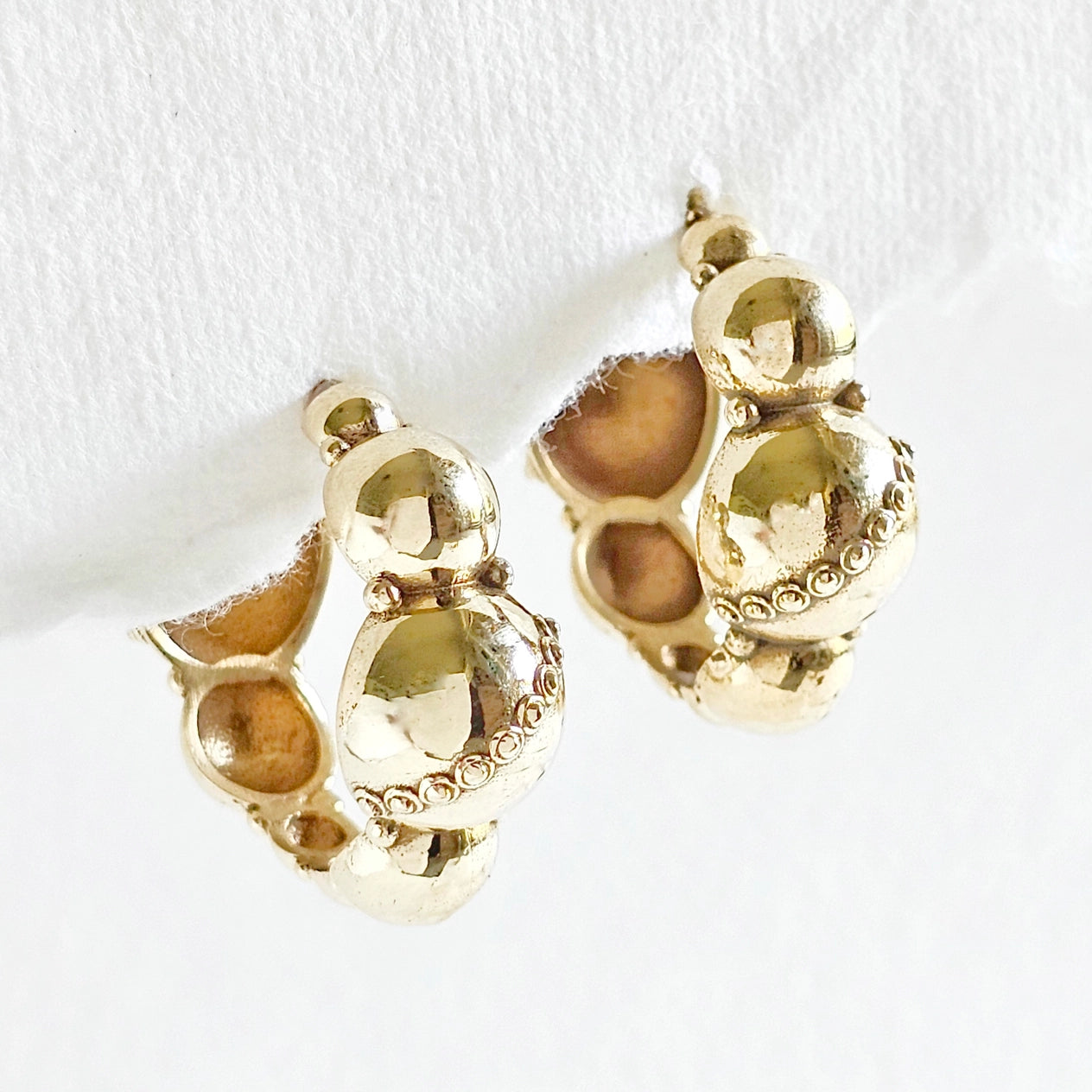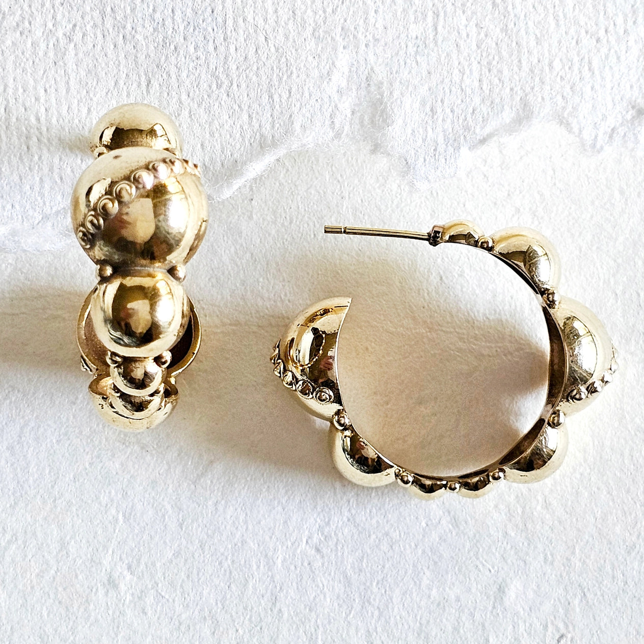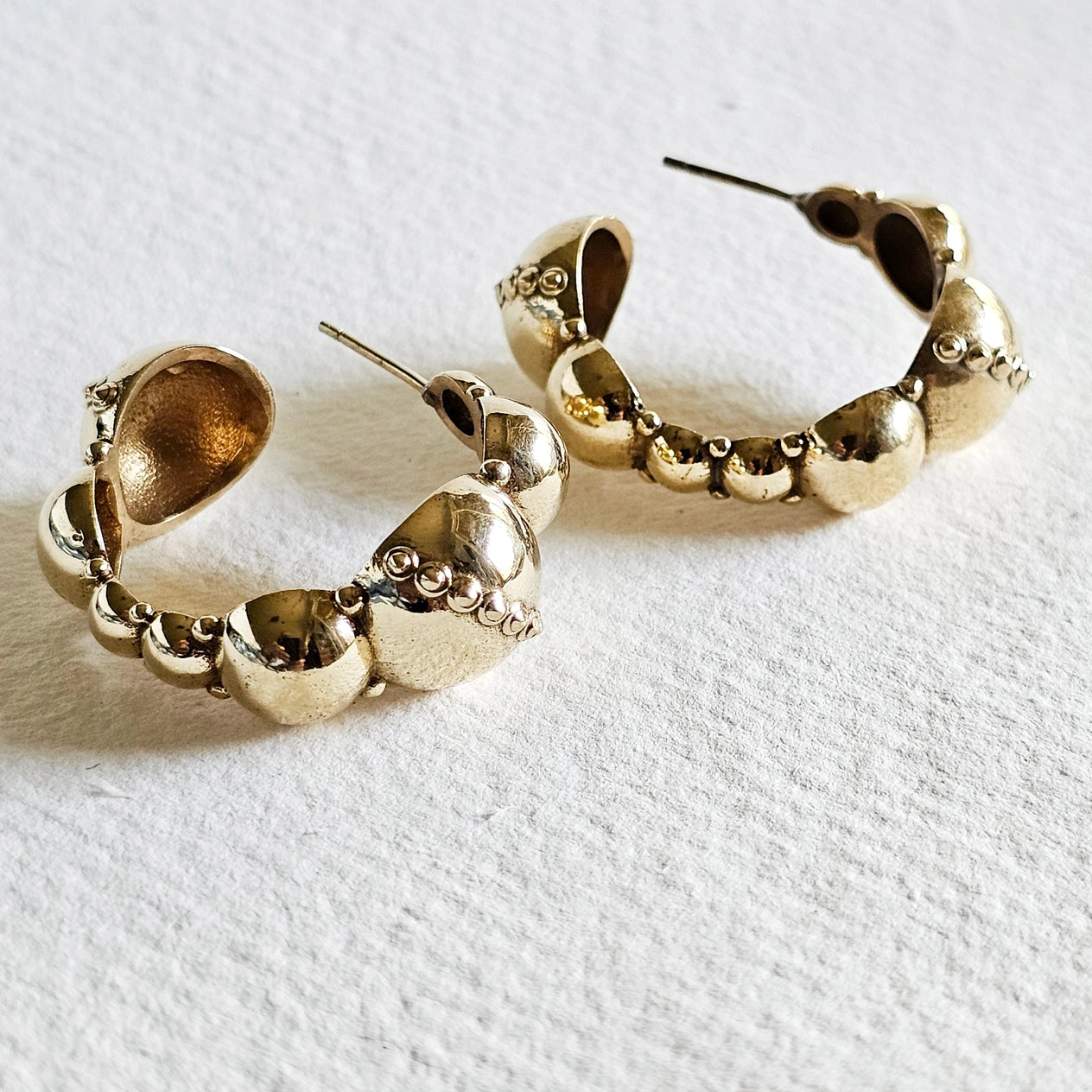 Unique brass dome hoop earrings with variated circles.