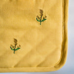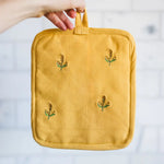 Bright and cheerful, this yellow pot holder is adorned with delicate embroidered flowers, bringing a touch of sunshine to any kitchen. Thoughtfully finished with a handy loop for easy hanging, it is as lovely to display as it is to use — a perfect blend of beauty and everyday charm.