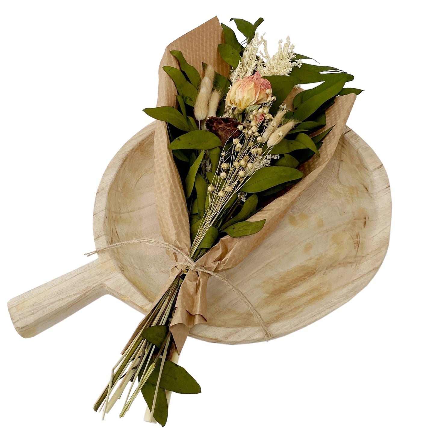This neutral arrangement features a mix of Flax, Cedar Rose, Bunny Tail, Willow Eucalyptus, and Broom Brown Bleach to create a simple but stunning bouquet.
