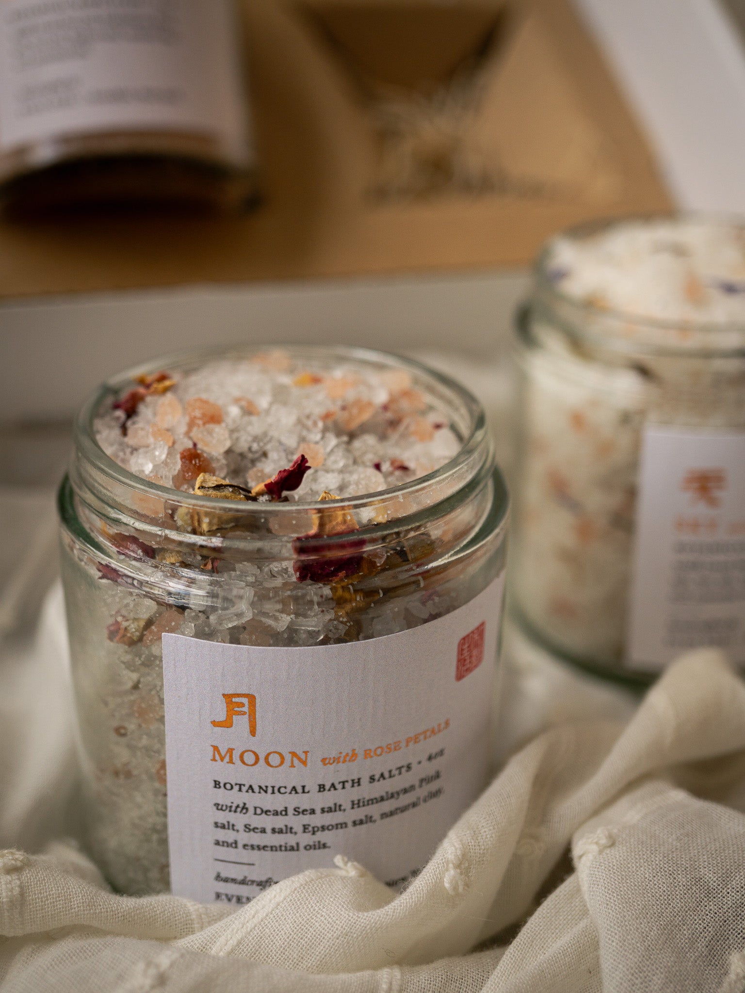 Moon: Dead Sea, Himalayan Pink, Sea, and Epsom; lulling a tranquil, inviting night atmosphere with a soothing blend of Lavender, Cedarwood, and Clove Bud essential oils.