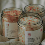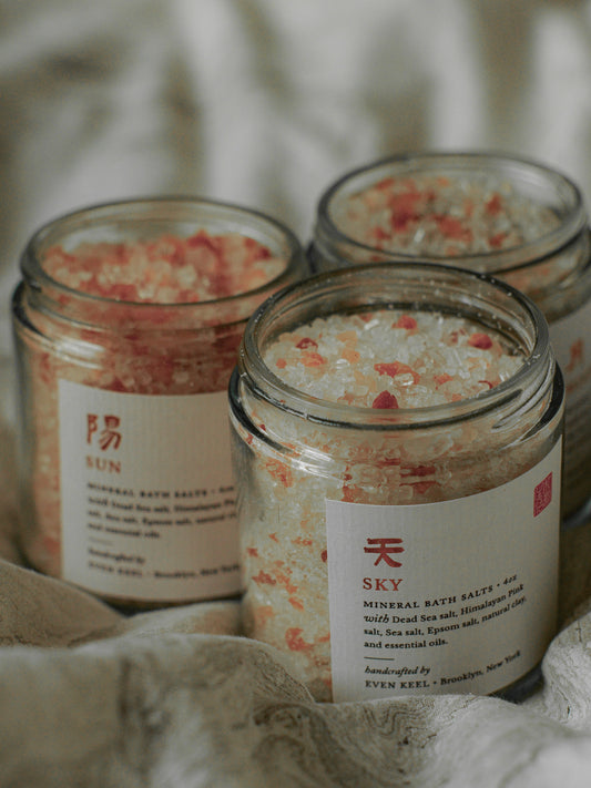 Even Keel's artisanal blend of four salts—Dead Sea, Himalayan Pink, Sea, and Epsom; evoking a powerful sensory delight through fragrant citrus essences.