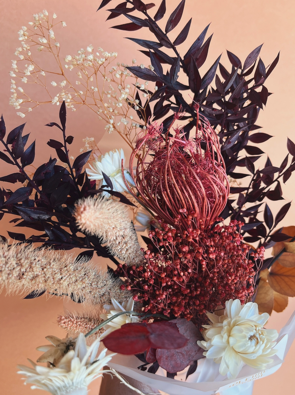 Dried flowers to last a lifetime. Celebrate Fall with this gorgeous arrangement of burgundy, copper and mauve dried flowers.