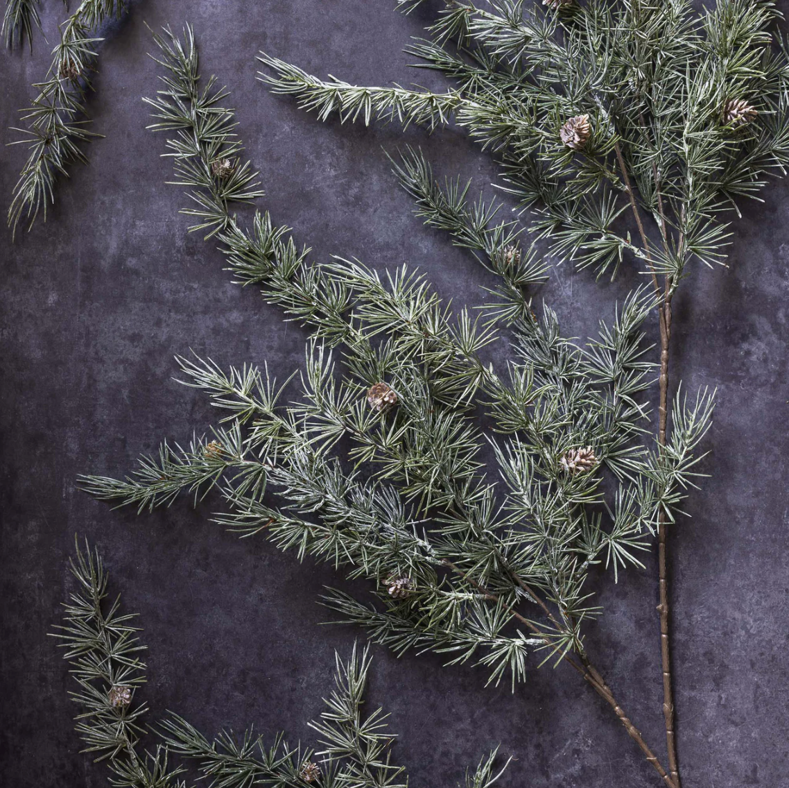 This perfect winter stem brings a beautiful boost of texture to any space this holiday season. Featuring soft pine needles and pinecones throughout, all dusted with a hint of snow, this faux branch is the perfect edition to any holiday arrangement, mantelpiece, or festive shelf.