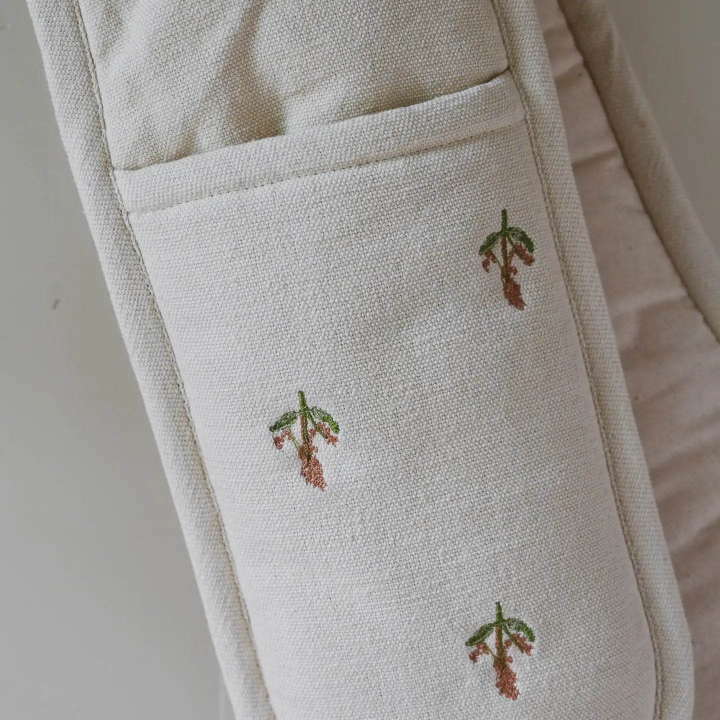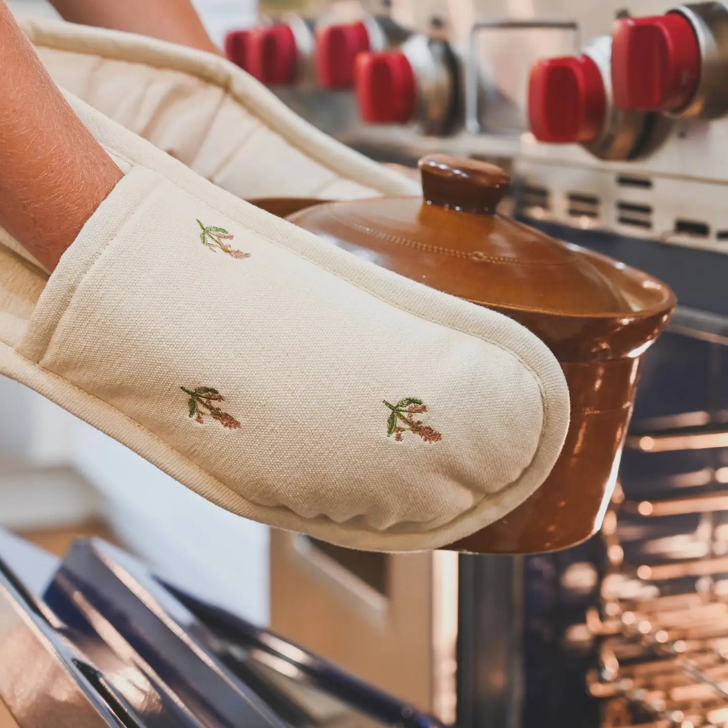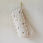 Crafted from a soft, natural cream fabric and adorned with delicate embroidered florals, this double oven mitt features two padded pockets to protect hands and arms from hot dishes. Thoughtfully designed with a loop for easy hanging, it is as lovely displayed in the kitchen as it is useful in daily life. Whether pulling a favorite dish from the oven or draping it gracefully over the oven door, this darling oven mitt elevates every moment with effortless beauty.