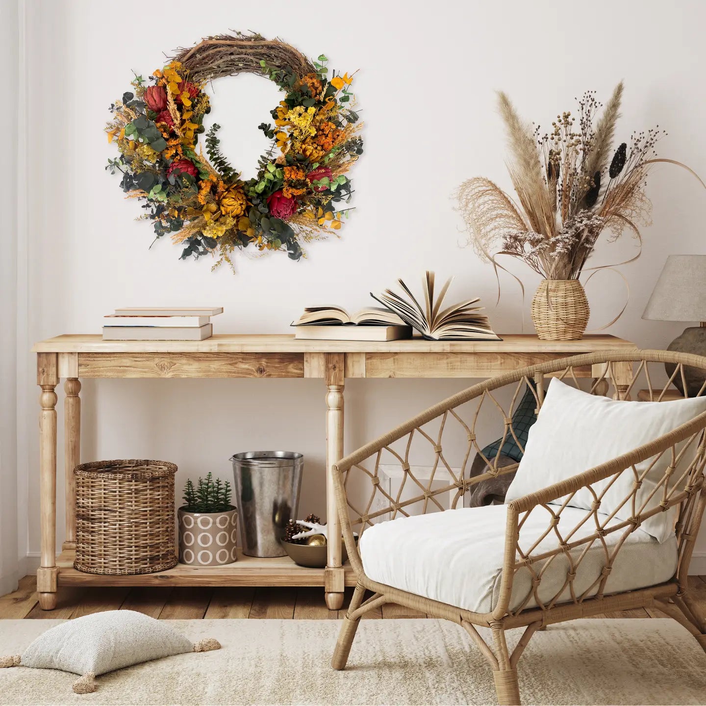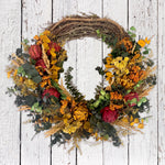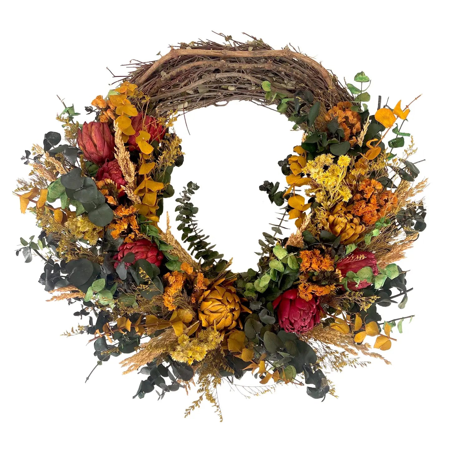 Crafted with all-natural materials like dried flowers, eucalyptus, and colored artichokes, this wreath evokes the true spirit of fall.