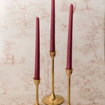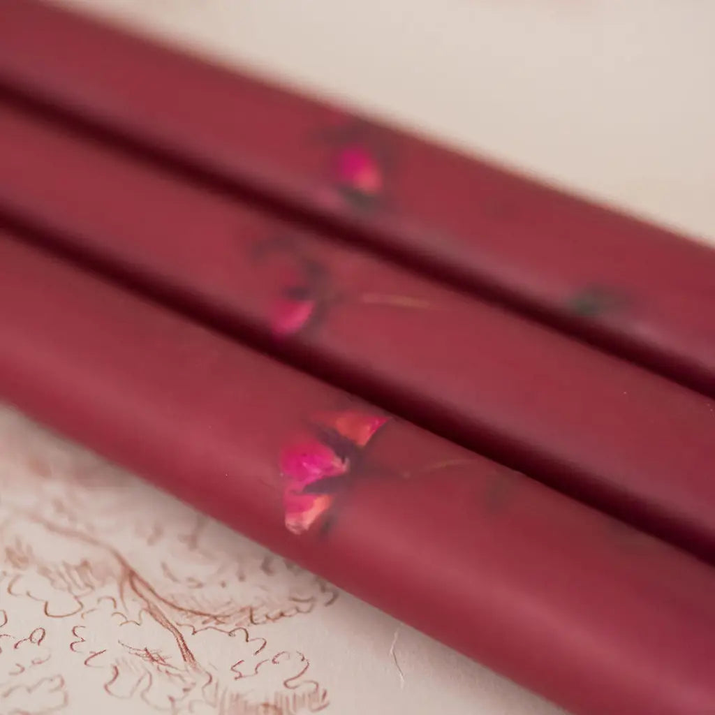 A delicate set of three soy and beeswax candles that fit perfectly into any taper candle holder. Each candle contains real dried flowers within its creamy wax—preserving the fleeting beauty of nature in every flickering light. The standard tapered candles, rich in burgundy hues, were lovingly inlaid with soft pink blossoms, creating a timeless dance of color and fragrance that whispered of twilight gardens and forgotten summer evenings.