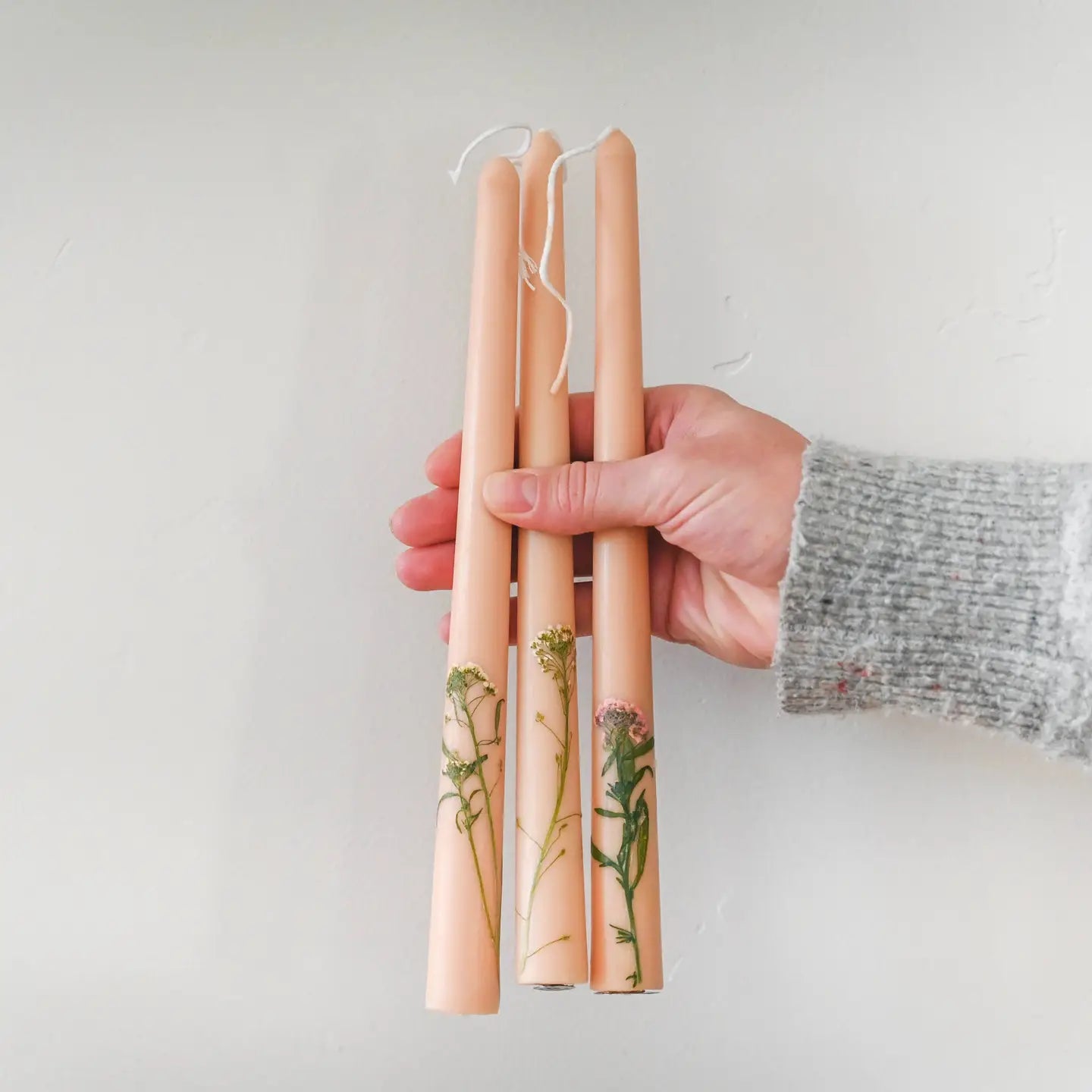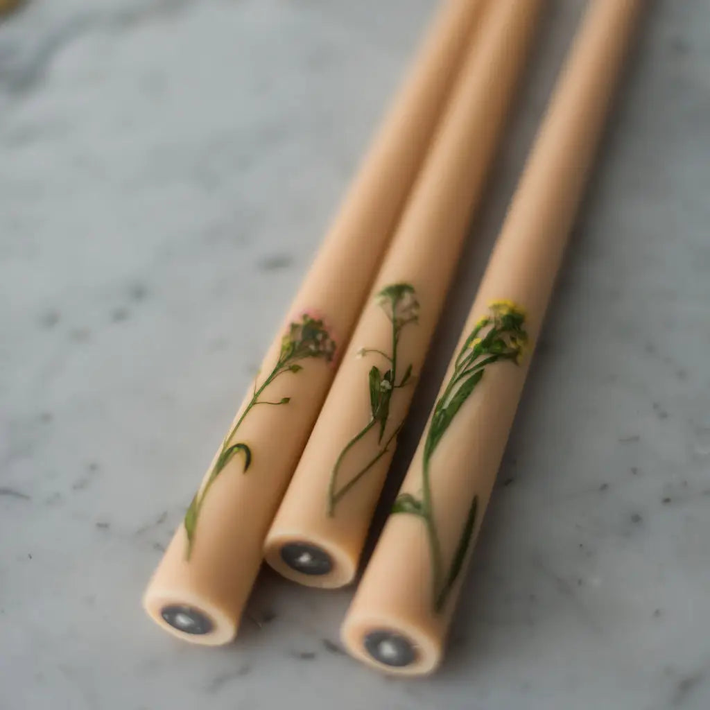 A graceful set of three soy and beeswax candles, thoughtfully designed to rest perfectly within any taper candle holder. Each candle contains real dried flowers, carefully placed by hand into the creamy wax. Every set includes a pastel pink, a soft cream, and a gentle yellow flower, weaving together a palette of delicate beauty meant to warm any space with quiet elegance.