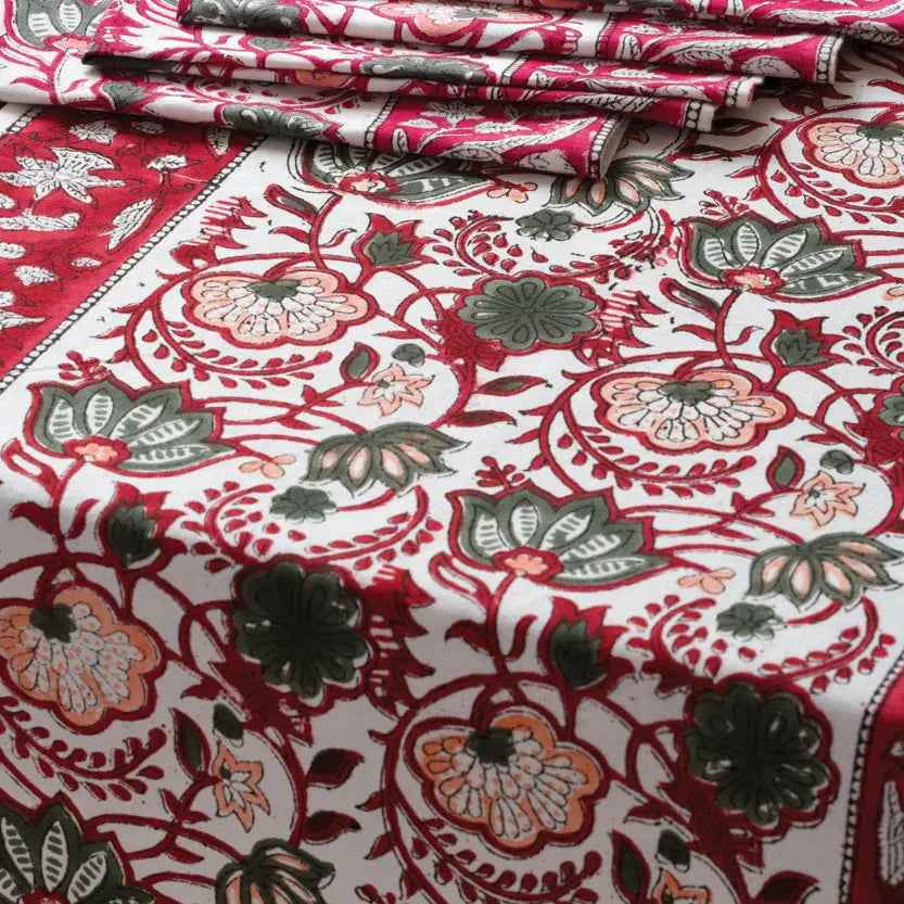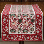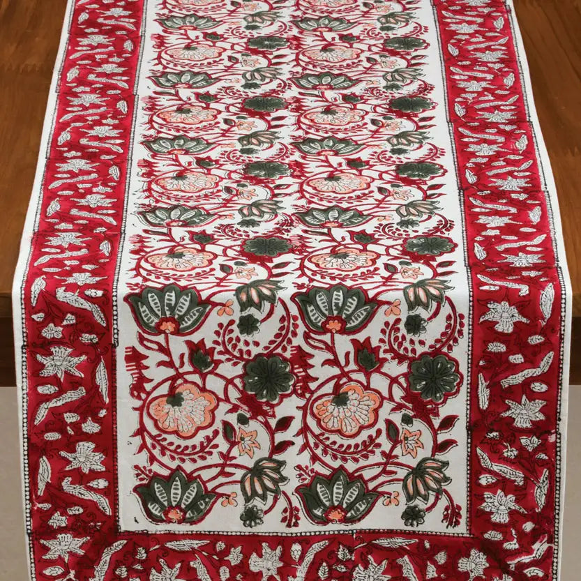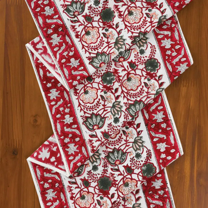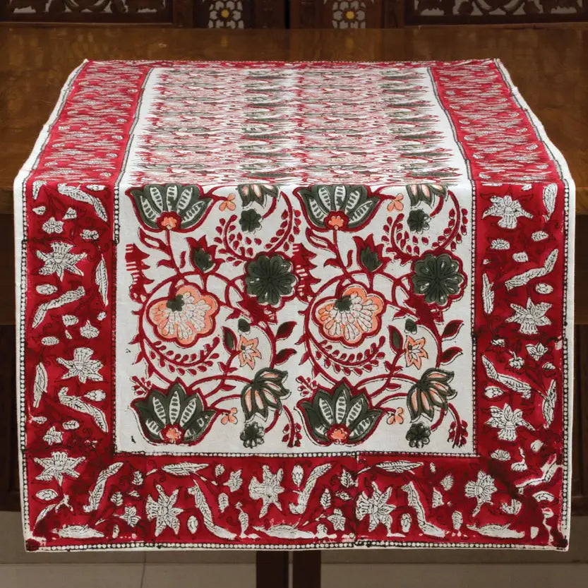 Our Red Floral Table Runner is made with soft 100% cotton canvas material and is hand block printed by artisans in Rajasthan, India using hand-carved wooden blocks. Great skill and precision is required for the artist to create these fine hand block prints, and the natural variations that occur with hand block printed textiles add to the authentic beauty of each piece. Our fair trade table runners have matching napkin sets and are machine washable. Each piece is a work of art and showcases the incredible block printing traditions of India with eco-friendly dyes.