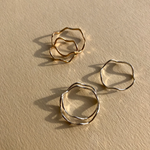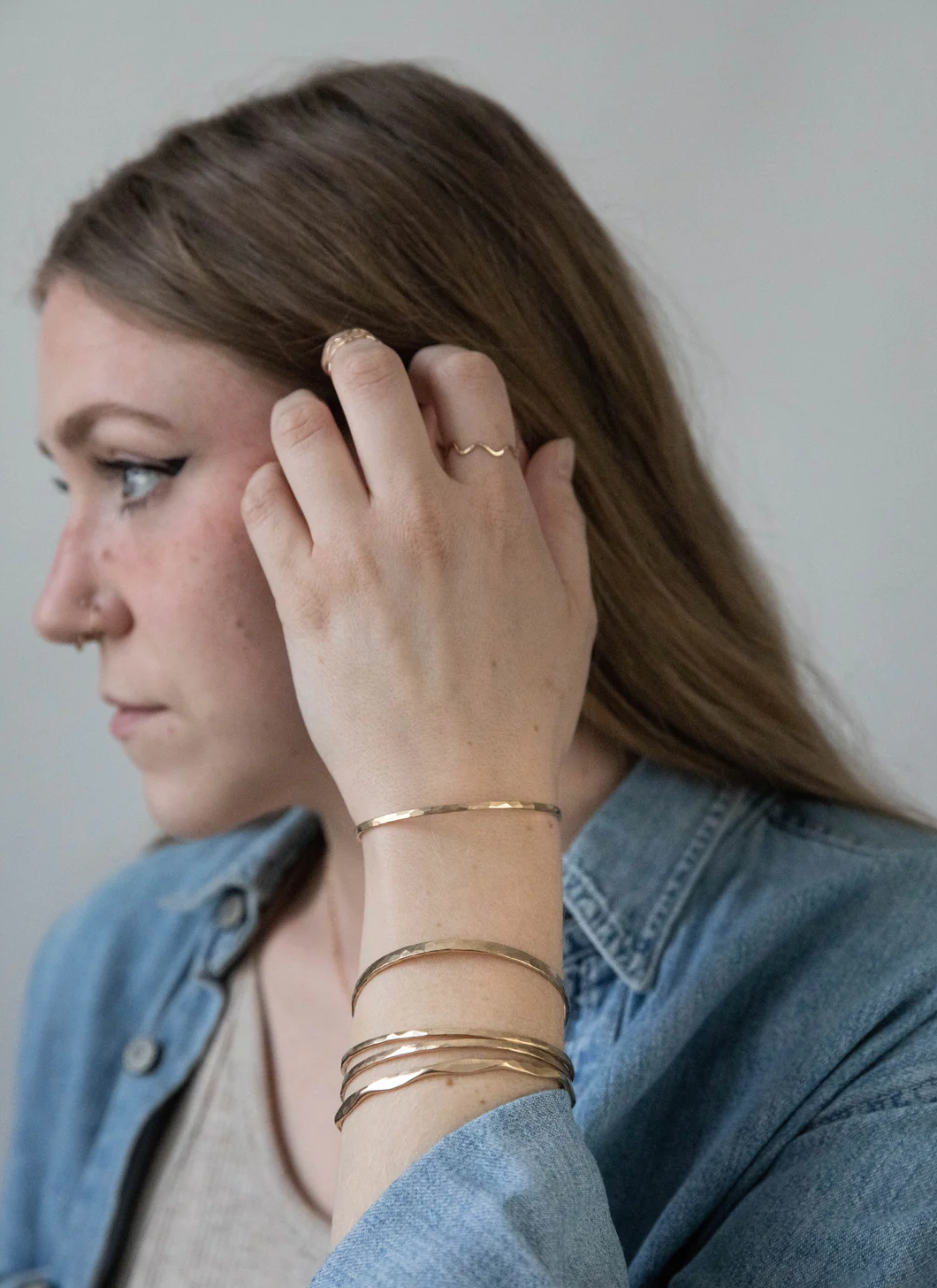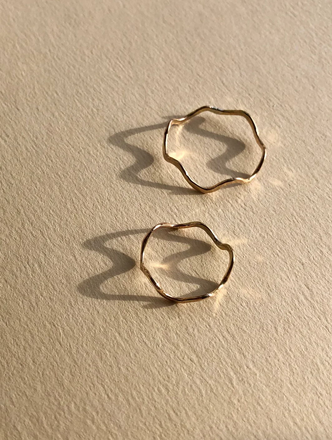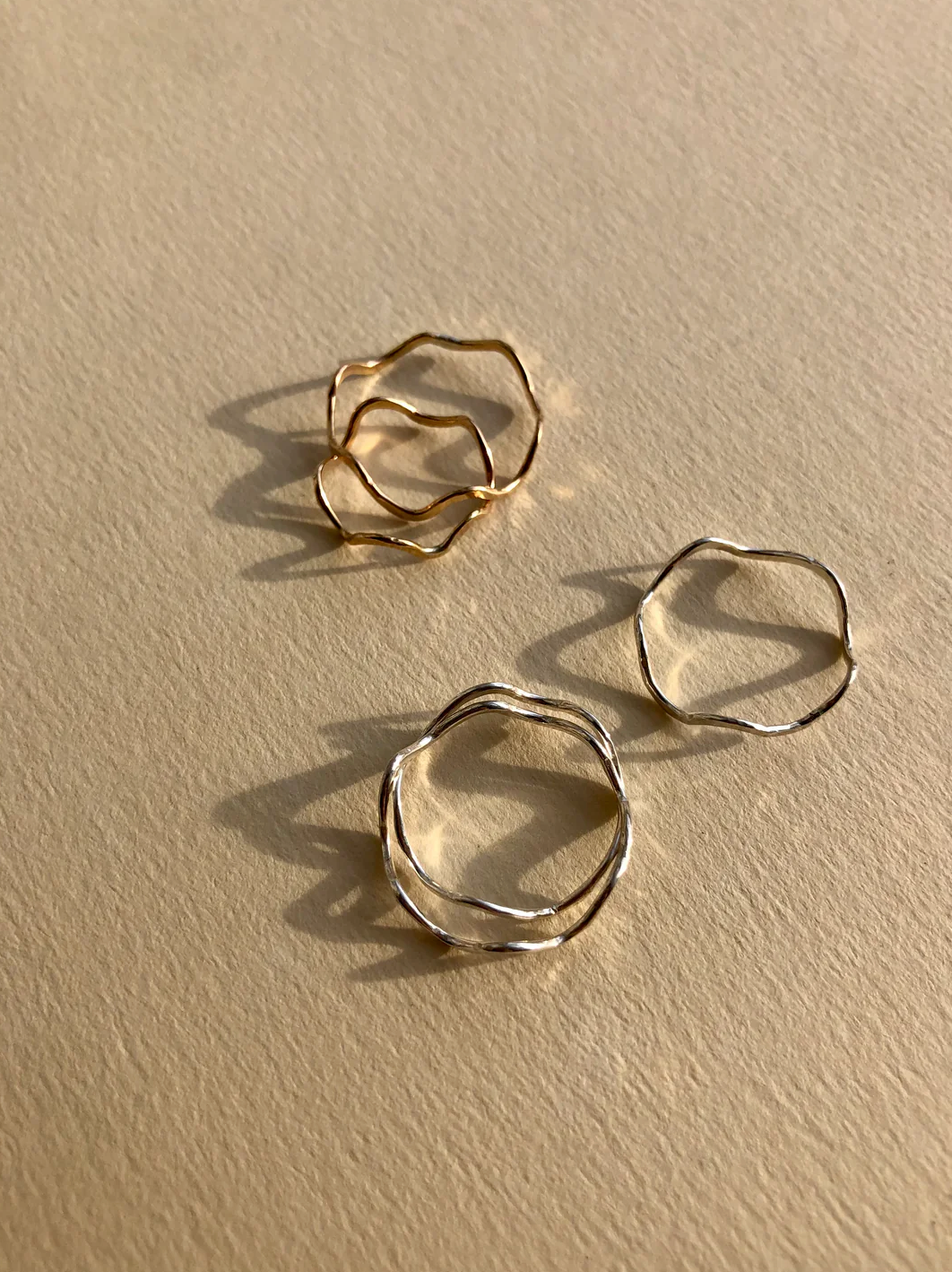 Go with the flow. These wavy stack rings are soldered, polished and hammered to 1mm thick. Textured to create facets that shimmer in the light.