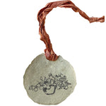 Leaf handmade paper circles with full deckled rounds. Black letterpress printed illustration of an arrangement of flowers and fruit in a vessel. Finished with botanically dyed silk ribbon loops in persimmon. Available as singles or sets of three. Perfect for thoughtful holiday gifts or to hang on your tree!