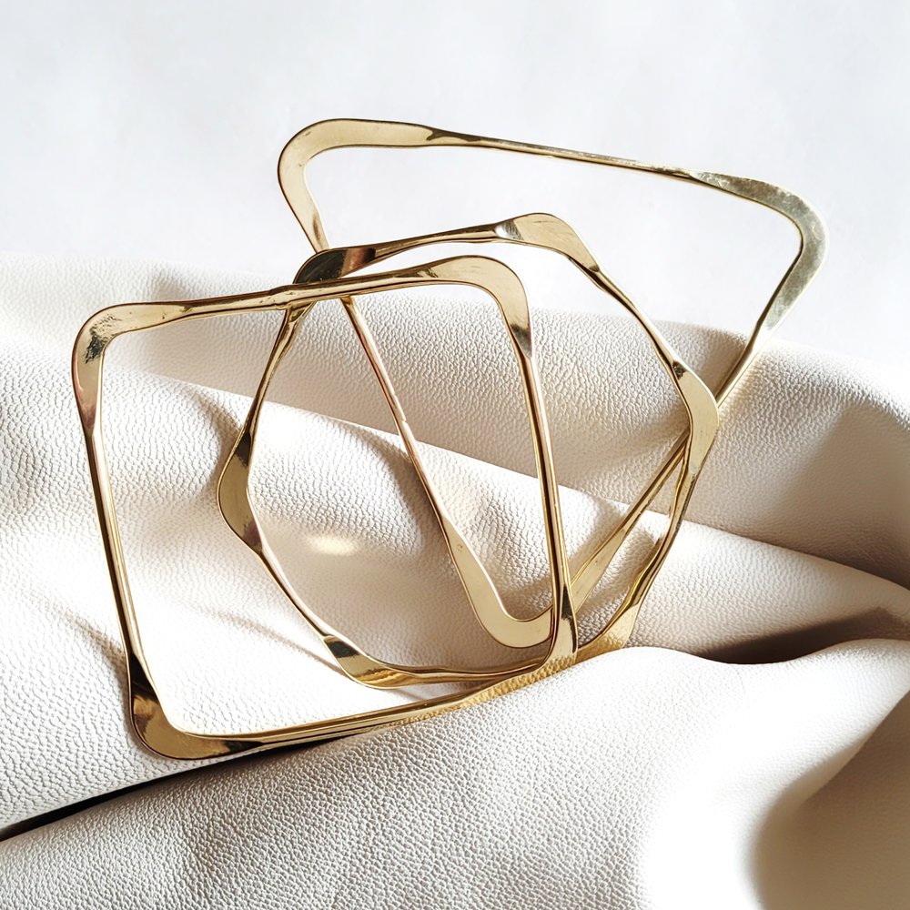 Set of three solid brass hammered geometric bangles. One of each - Square, Circle, Triangle. The handcrafted nature renders no two pieces alike.