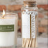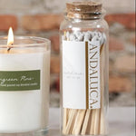 Set of 60 matches with a white tip housed in a rustic corked glass jar. The jar has a match striker on the back for lighting.