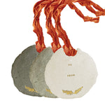 Leaf handmade paper circles with full deckled rounds. Black letterpress printed illustration of an arrangement of flowers and fruit in a vessel. Finished with botanically dyed silk ribbon loops in persimmon. Available as singles or sets of three. Perfect for thoughtful holiday gifts or to hang on your tree!