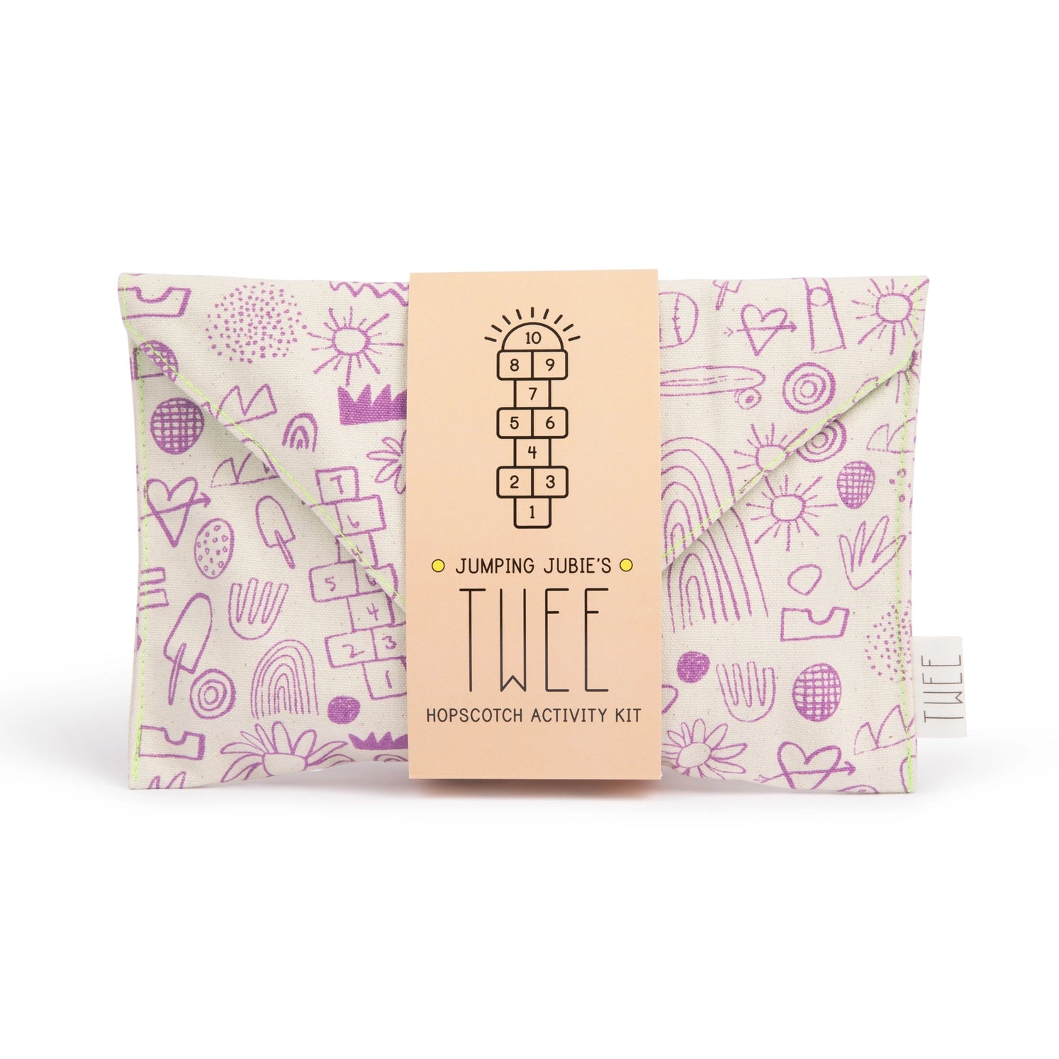 Hop, skip, and jump with your TWEE Hopscotch Kit, an adorable canvas pouch filled with chalk for drawing your hopscotch squares, and a wooden coin to complete your game-playing needs!