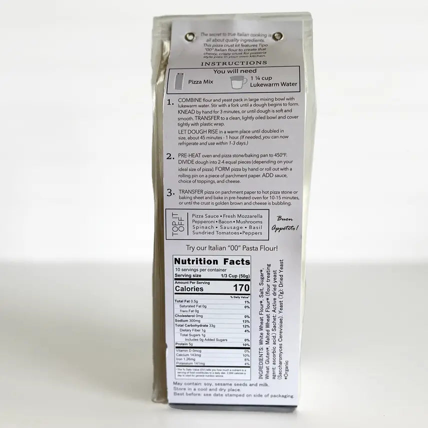 Discover the essence of true Italian cooking with our pizza kit, designed to elevate your homemade pizzas to pizzeria-style perfection. The key to that chewy, crispy crust lies in our premium Tipo "00" Italian flour included in the kit. Just add water, and with the yeast also provided, you're all set to craft delectable pies right in your own kitchen. Embrace the magic of quality ingredients and experience the ultimate pizza-making adventure. Unlock the secrets of authentic Italian flavors with our easy-to-use pizza kit!
