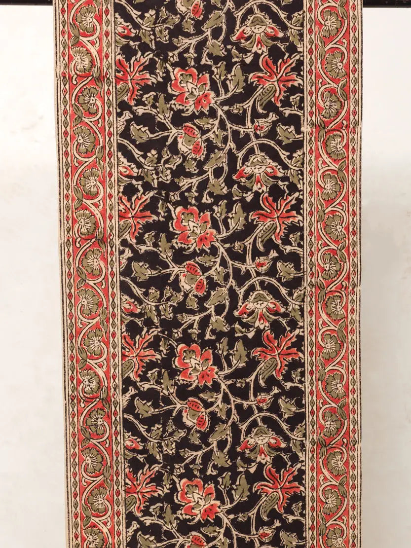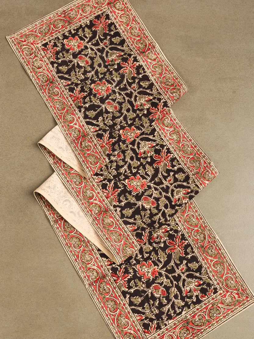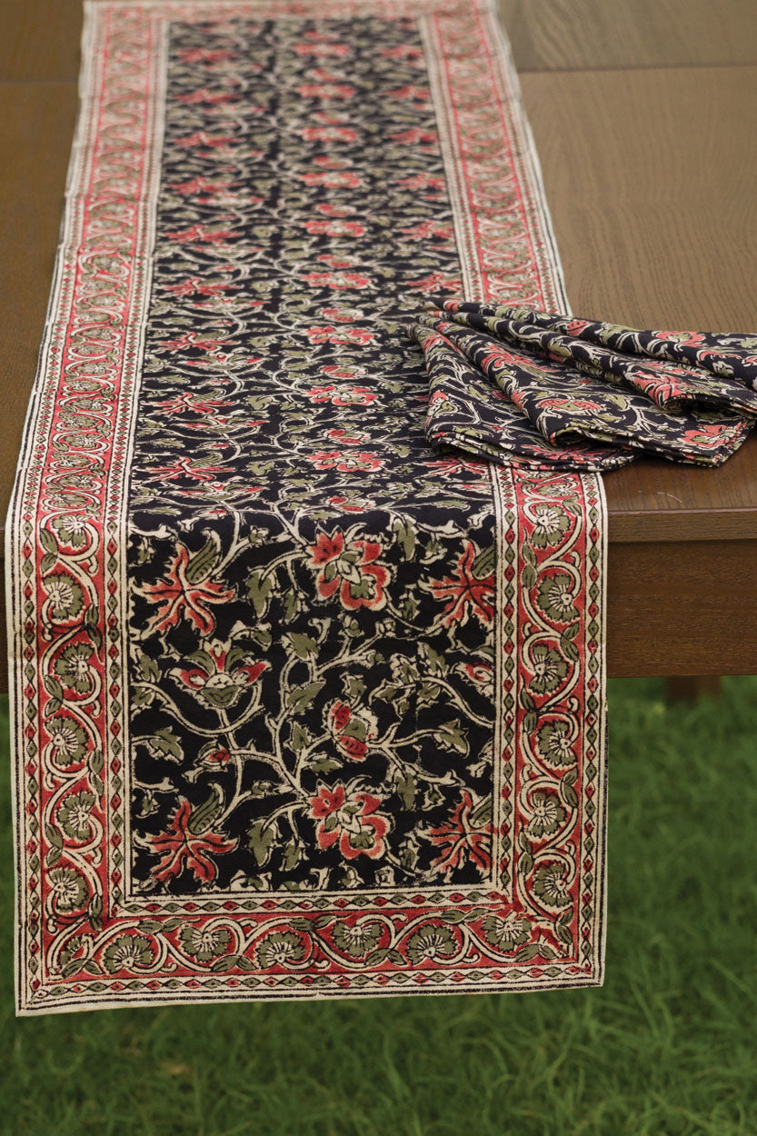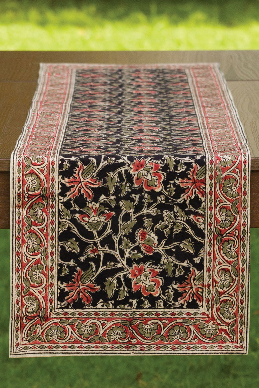 Kalamkari Table Runners are made with 100% sturdy cotton canvas and natural plant-based dyes. Artisans in Southern India print the fabric for these handmade table runners using the block-printing style known as “kalamkari”, which involves printing the fabric with natural dyes using wooden blocks and then filling in the details with hand painting. Each piece is a work of art and showcases the beautiful block printing traditions of India with eco-friendly dyes.