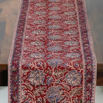 Kalamkari Table Runners are made with 100% sturdy cotton canvas and natural plant-based dyes. Artisans in Southern India print the fabric for these handmade table runners using the block-printing style known as “kalamkari”, which involves printing the fabric with natural dyes using wooden blocks and then filling in the details with hand painting. Each piece is a work of art and showcases the beautiful block printing traditions of India with eco-friendly dyes.