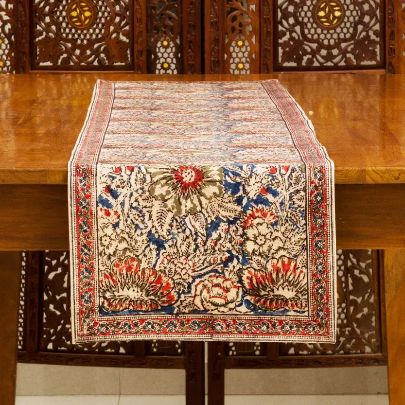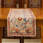 Our Kalamkari Table Runners are made with sturdy 100% cotton canvas and natural plant based dyes. Artisans in Southern India print the fabric for these handmade table runners using the block-printing style known as “kalamkari”, which involves printing the fabric with natural dyes using wooden blocks and then filling in the details with hand painting. Our fair trade table runners have matching napkin sets and tablecloths and are machine washable. Each piece is a work of art and showcases the beautiful block printing traditions of India with eco-friendly dyes. Napkins sold separately.