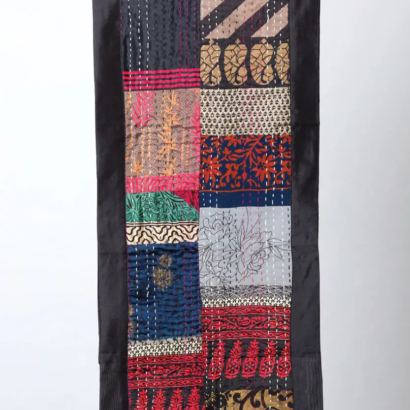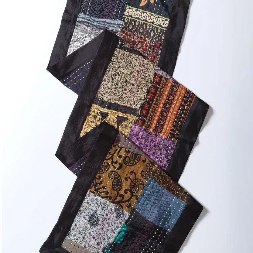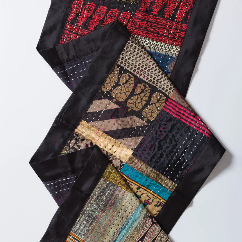 Our Kantha Silk Table Runners are handmade by women artisans in West Bengal, India using 100% silk up-cycled saris. Each piece is unique and is made from up-cycled silk saris that are stitched together using the traditional “kantha” embroidery technique. Featuring an artistic patchwork design on one side and a solid cotton material on the reverse side with the fine kantha stitching. Kantha linens, apparel and accessories are sustainable, unique works of art. Assorted prints and colors with a predominant black theme.
