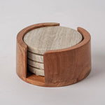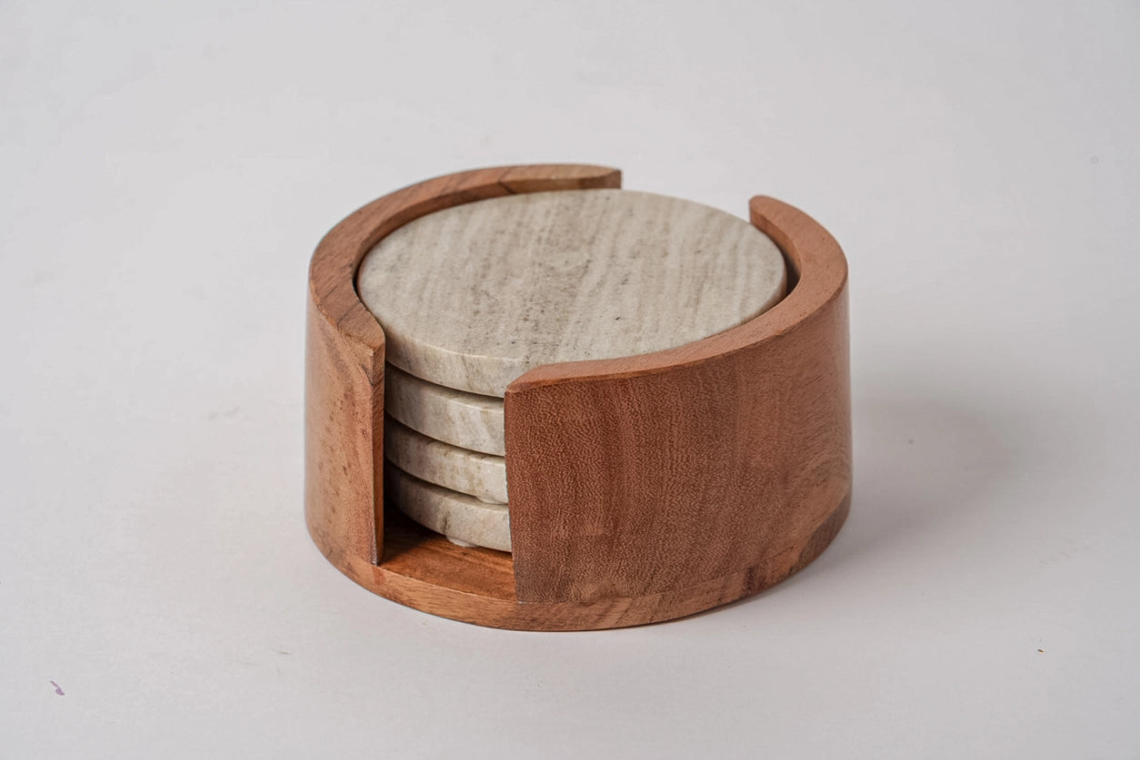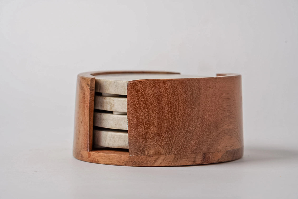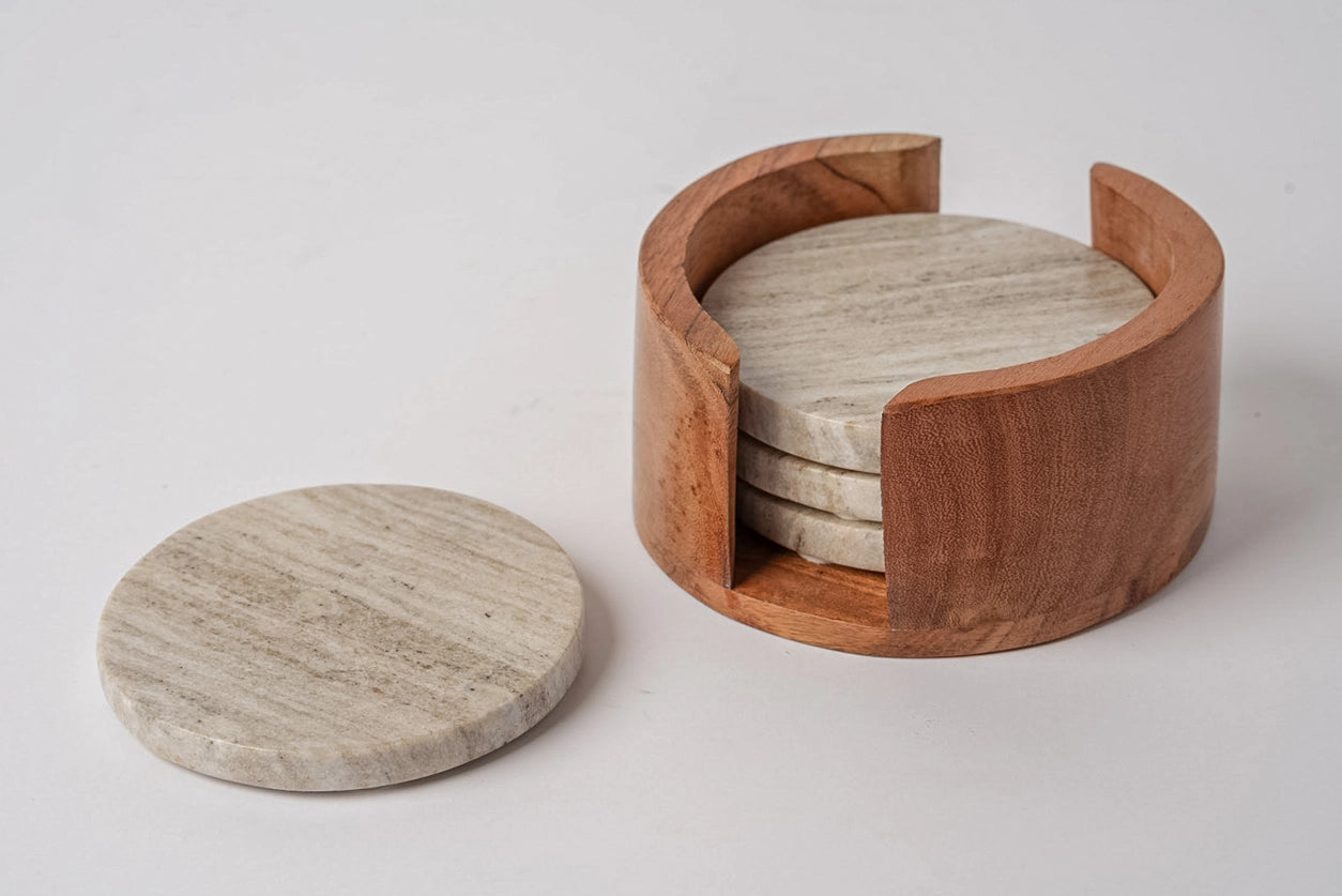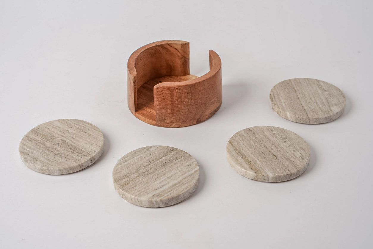 Enhance tabletops with these beautiful round marble coasters - a stylish and functional addition to any space in a timeless design that complements any decor style. Crafted from premium marble these coasters protect surfaces from water rings and heat damage while adding a touch of natural elegance. Paired with a beautifully designed wooden holder to keep coasters neatly stored and easily accessible.