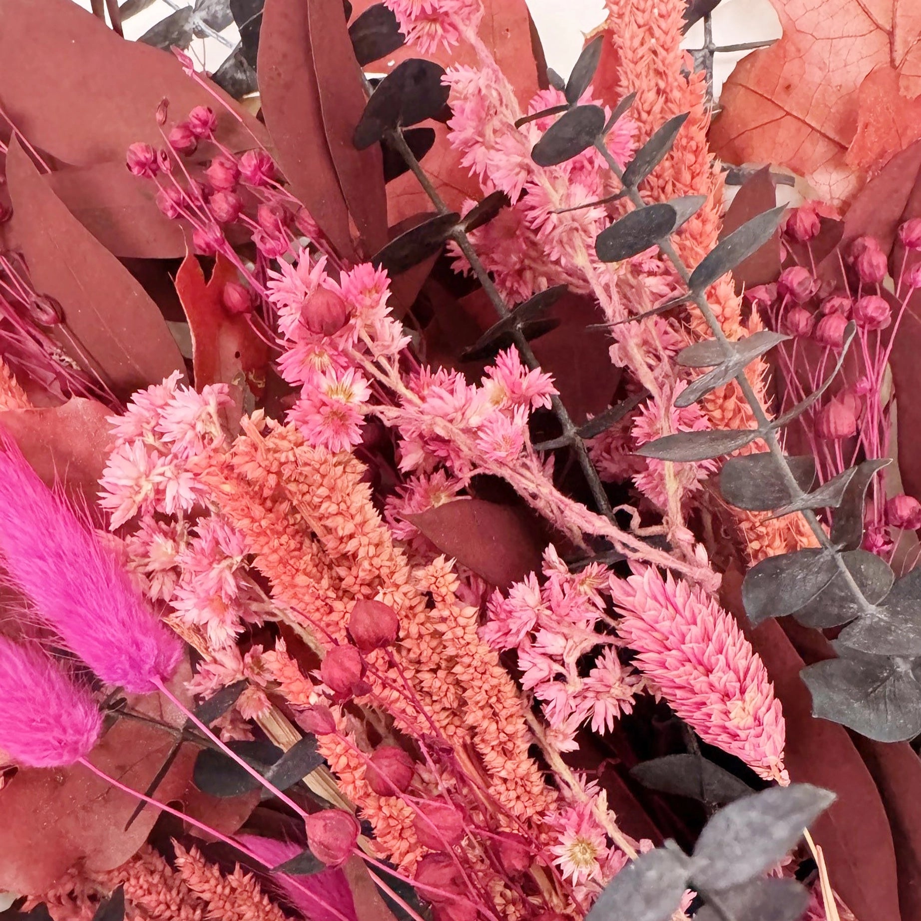 This beautiful bouquet is designed using a mix of natural flowers and leaves to create this rich and bold look. Includes Oak leaves, preserved baby eucalyptus, flax, phalaris, sorghum, & ammobium.