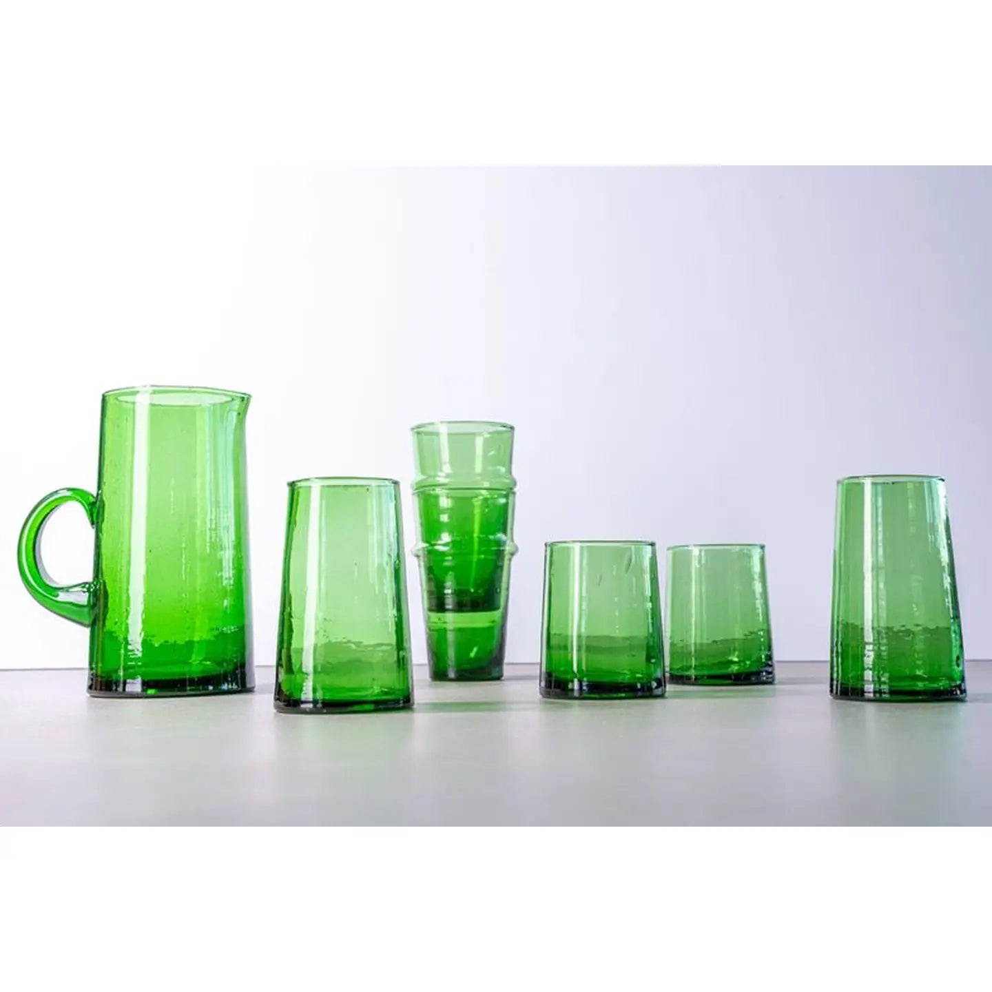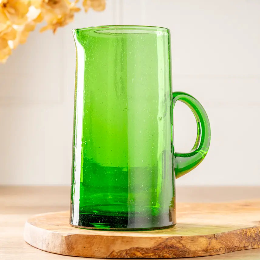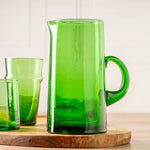 Our Moroccan glassware jugs come in four distinct shades of transparent glass (Clear, Amber, Blue & Green). The handblown construction is evident in the bubbles suspended in the glass itself, and the organic forms that the vessels take.