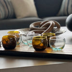 The Moroccan glassware is made from recycled wine bottles, beer bottles, jars, or other glass containers. Slight variations in hue/color can arise due to variations in temperature, the amount of glass used, or even the artistic choices made during production. These differences contribute to the unique charm and individual character of each piece.