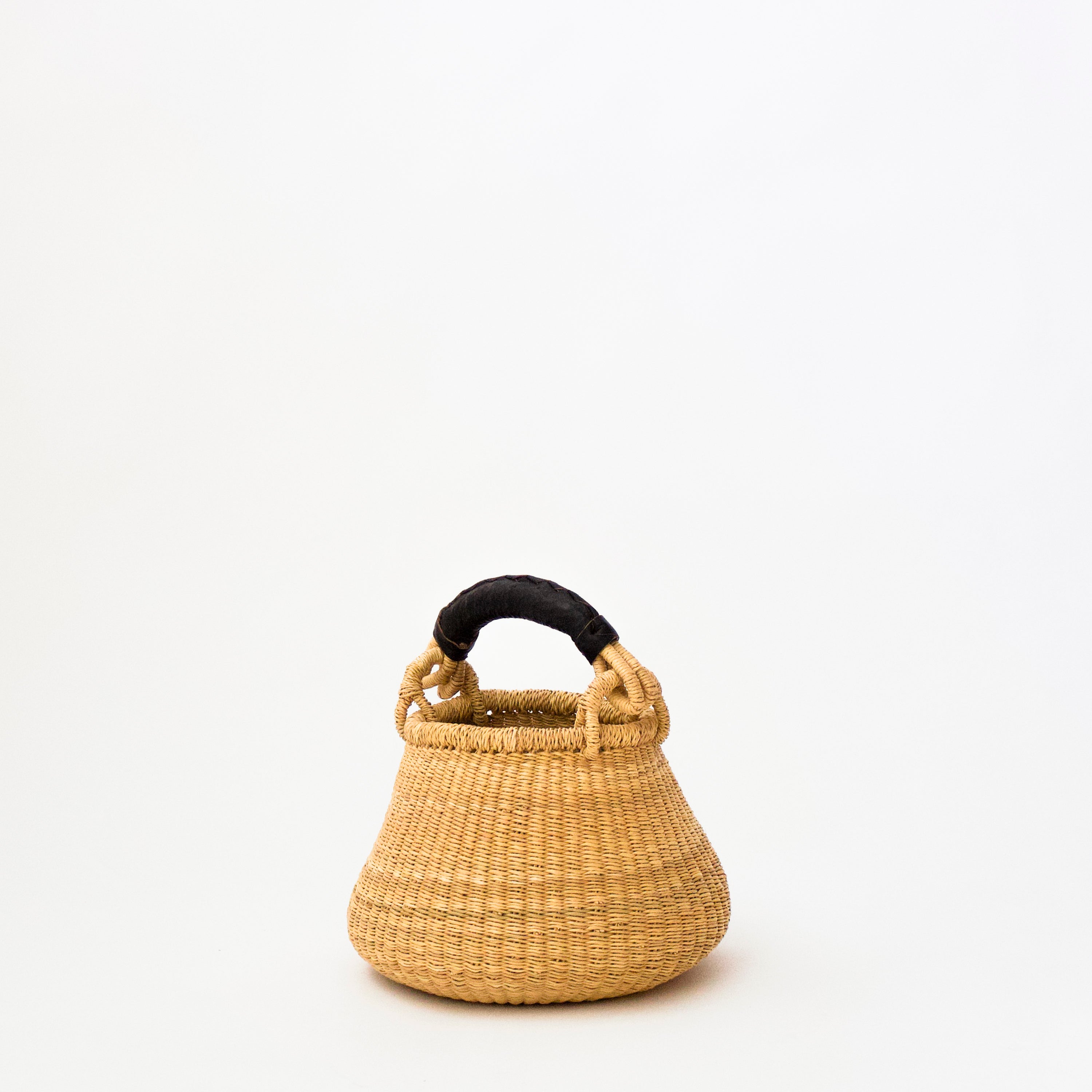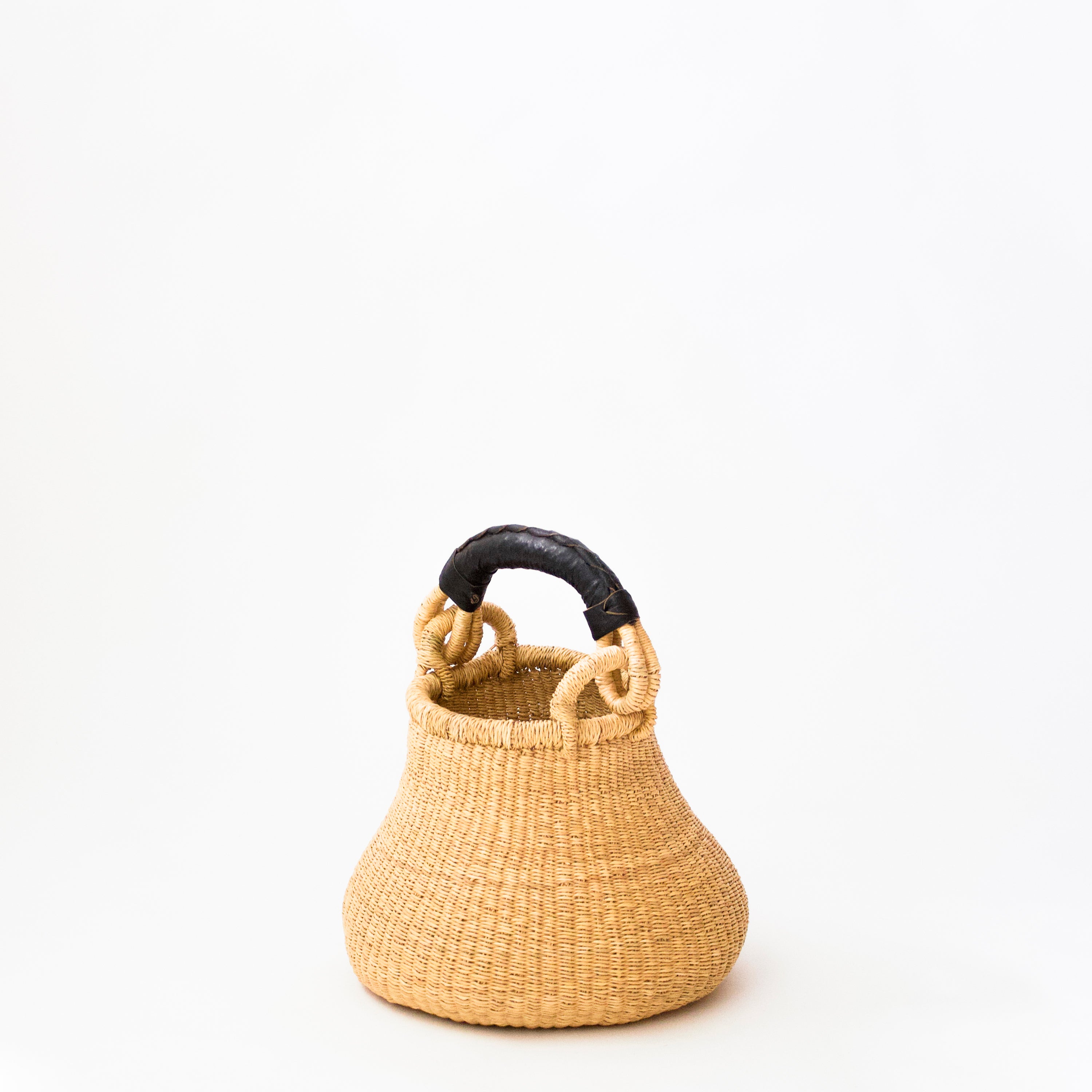 This handcrafted tote is exquisitely woven with natural grasses and has beautifully wrapped leather handles. It is made by artisans in Bolgatanga, a northern region of Ghana. Each purchase supports this traditional craft and the artists who create it. Each basket that is sold helps to reduce poverty in Northern Ghana.