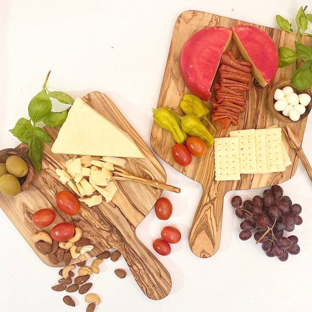 Beautifully designed olive wood boards for serving, display, carving, or cutting! Impress your company, or simply enjoy an elegant night in with these uniquely patterned wood grain boards. Available in multiple sizes for any occasion.  Olive wood is a hardwood making it very dense and durable for everyday use. Olive wood is nonporous so no germs or odors are retained.