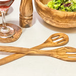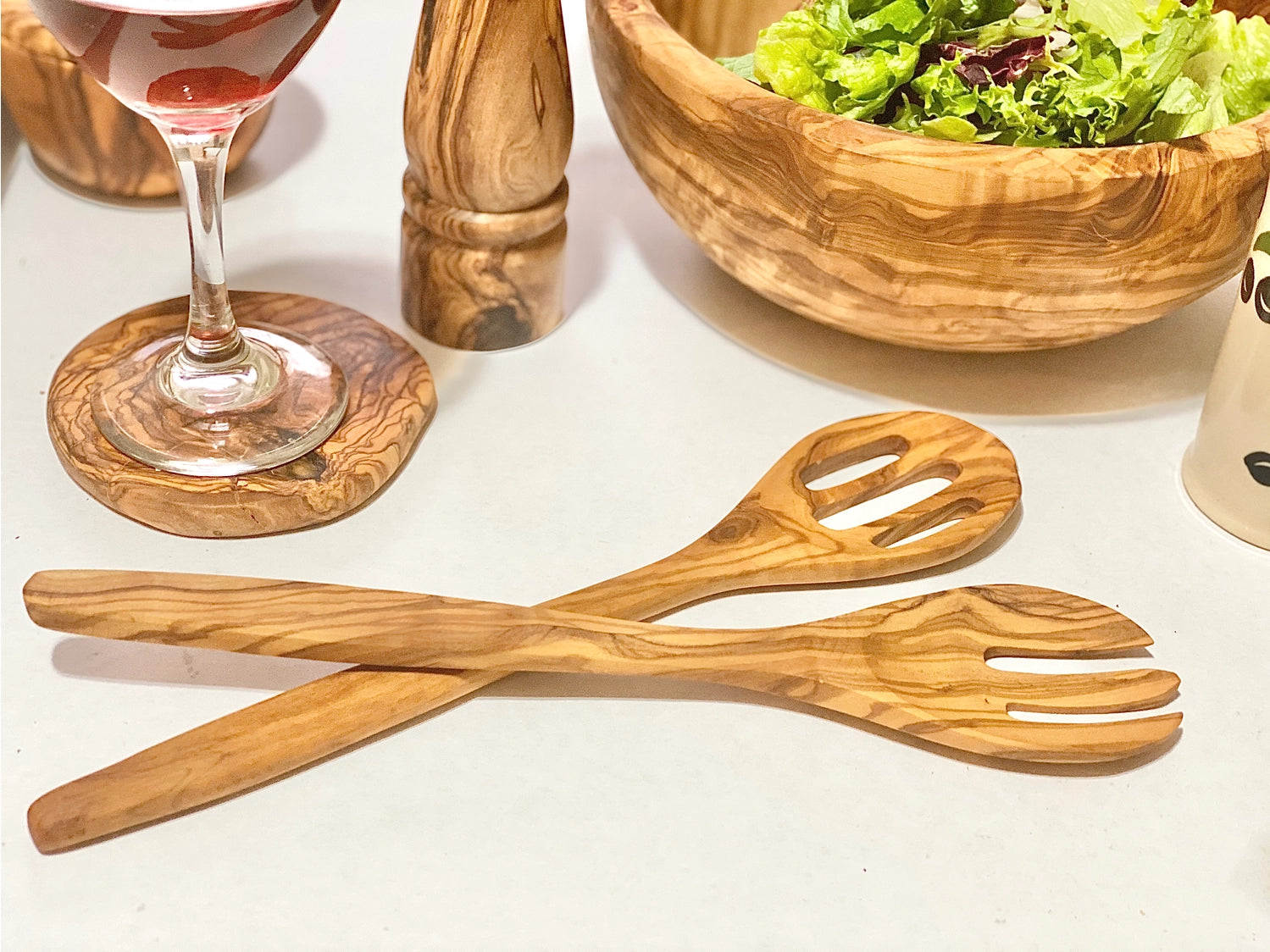 Olive Wood Salad Servers are the perfect size to scoop and serve salad. They are also great for serving pasta, rice, and more! Olive wood is a hard wood making it very dense and durable for everyday use. Olive wood is nonporous so no germs or odors are retained. All products are made from a single piece of wood- they are seamless and no two pieces are alike.