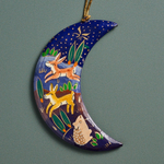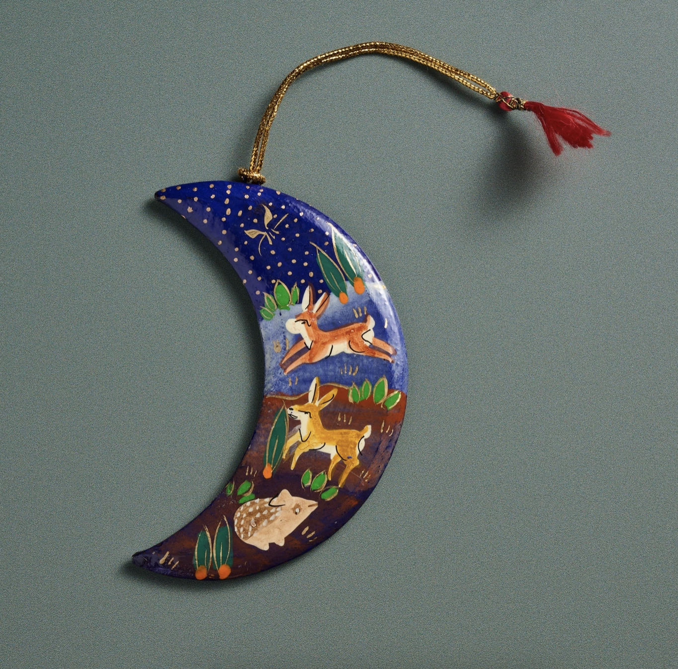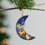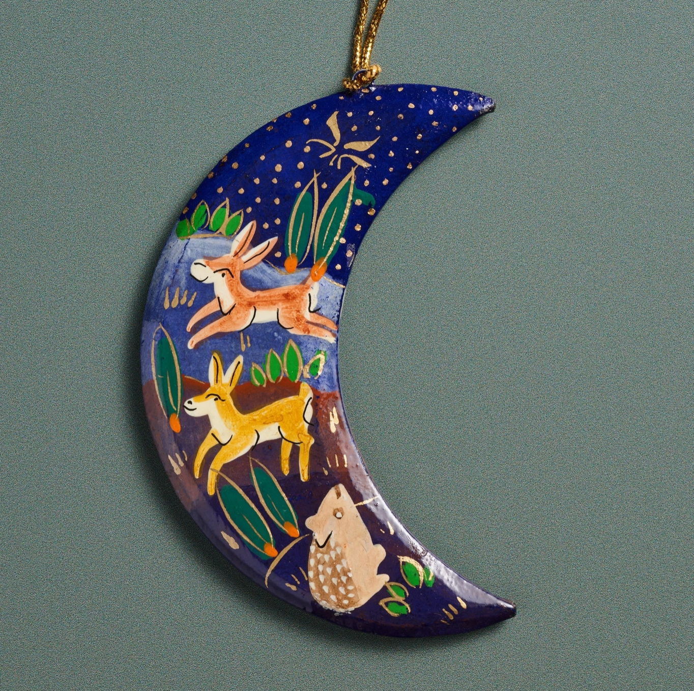 This moon-shaped ornament made from 100% paper mâché brings a feeling of peace and calm. Hand painted on both sides with a night sky and sweet woodland creatures and complete with a gold cord for hanging, this ornament makes a beautiful gift for a beloved child or any nature-lover.