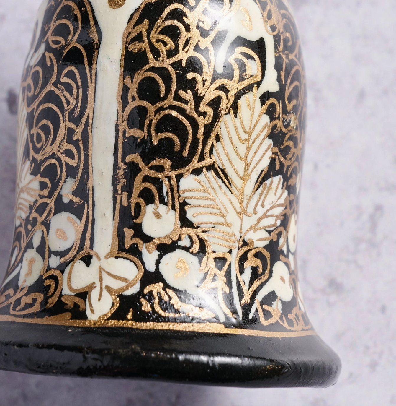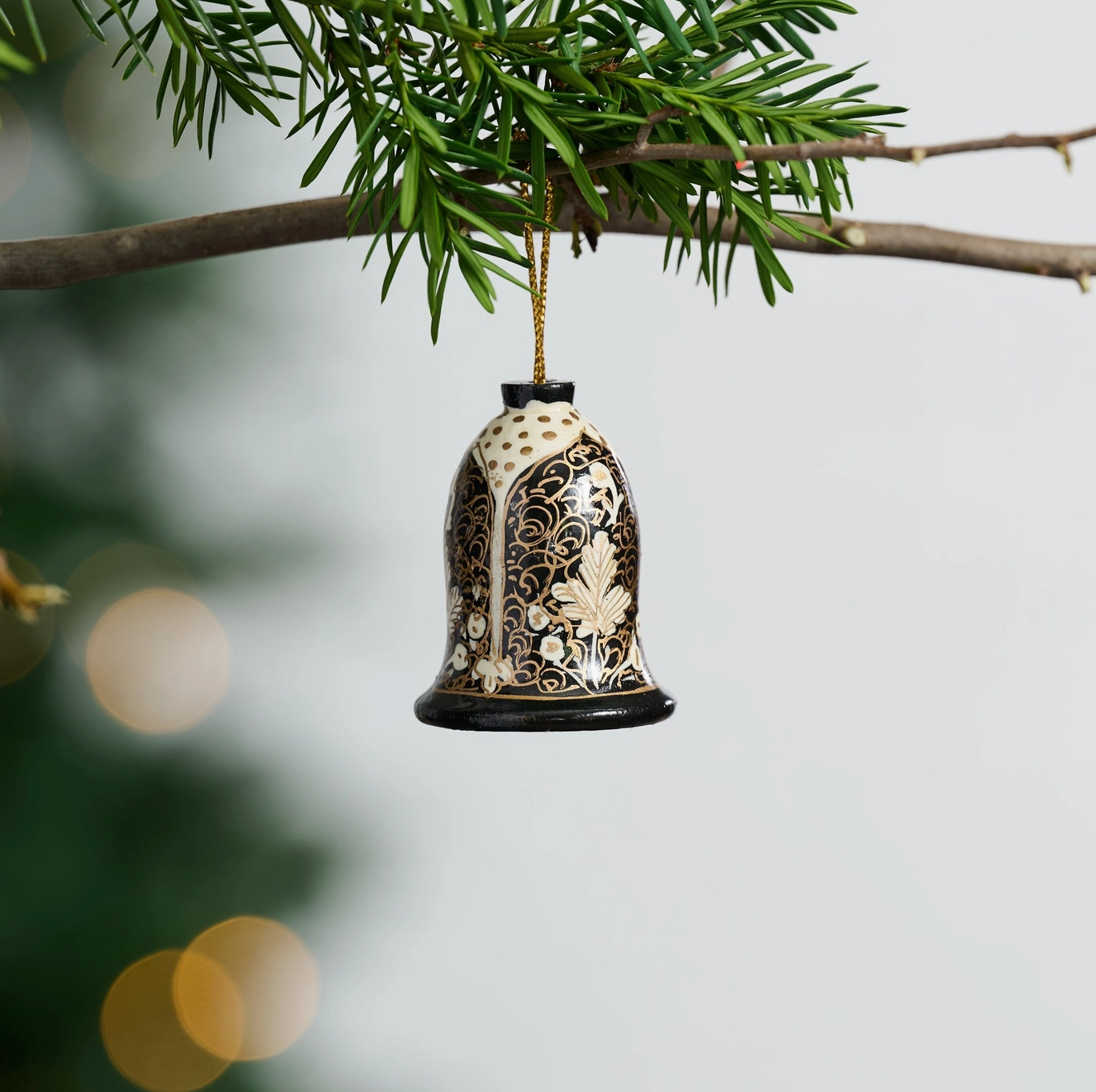 The bell is a timeless symbol of a calling to celebrate and give thanks. This three-dimensional wooden bell ornament is the perfect addition to your seasonal decor, hand painted with an elegant combination of leaves, filigree and arches in traditional black, ivory and gold. Also makes a meaningful holiday gift!