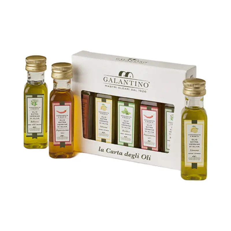 The Pocket Gift Pack of Flavored Extra Virgin Olive Oils by Galantino includes 5 20ml bottles of delicious fused oils packed in a gift box. Flavors include hand-skimmed affiorato oil, spicy peperoncino, lemon, basil, and aromatic mixed herbs. Using an ancient technique revived by Galantino in the 1990s, fused oil is produced by crushing together the olives and fresh herbs, chili peppers, or citrus, without the use of any added essences. The result is an intense, richly flavored extra virgin olive oil.