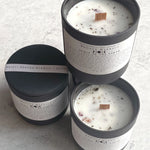 Each candle is made with 100% soy and coconut wax, with an untreated crackling wood wick.