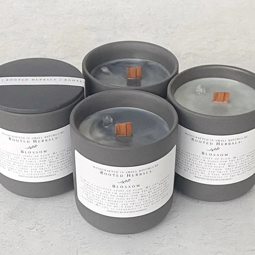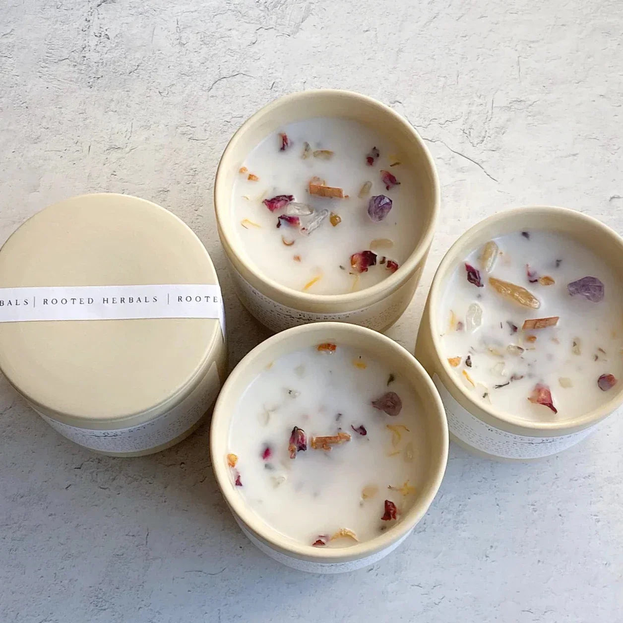Candles crafted with intentions. Each includes a carefully chosen blend of essential oils, natural fragrances, and crystals.
