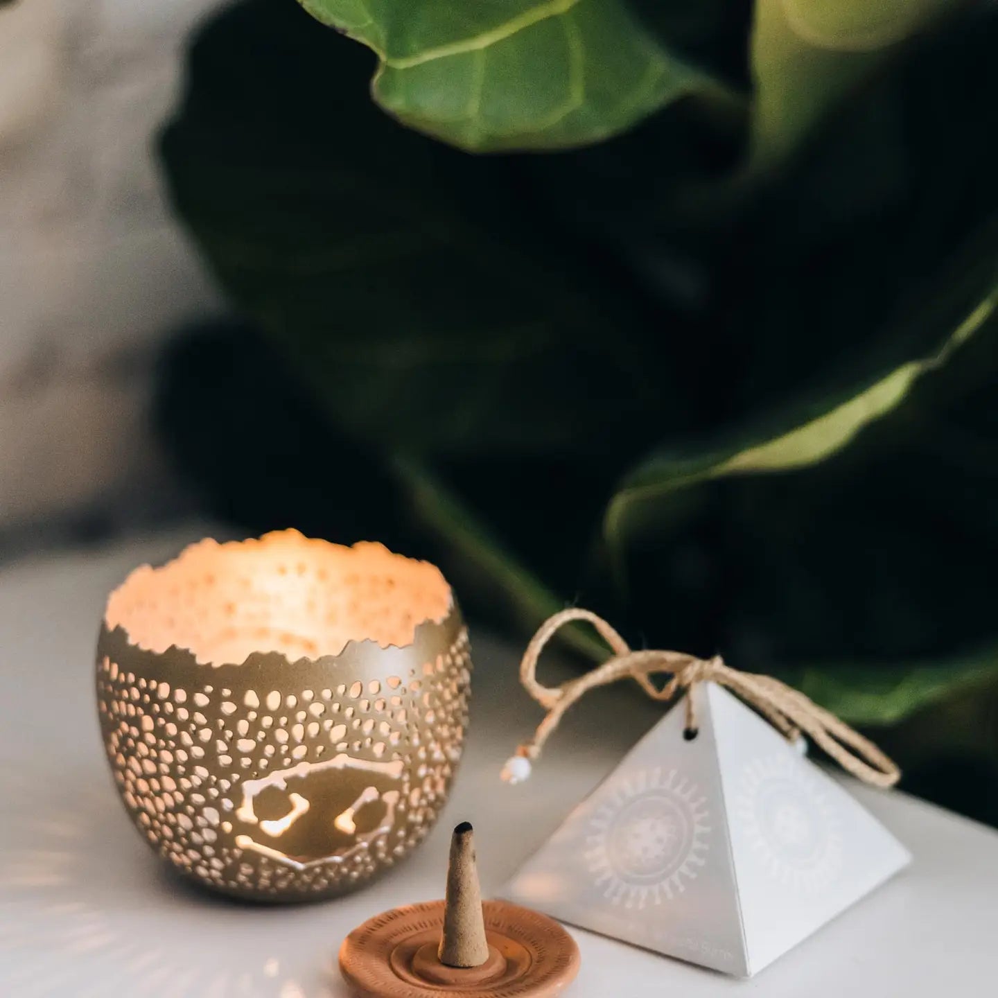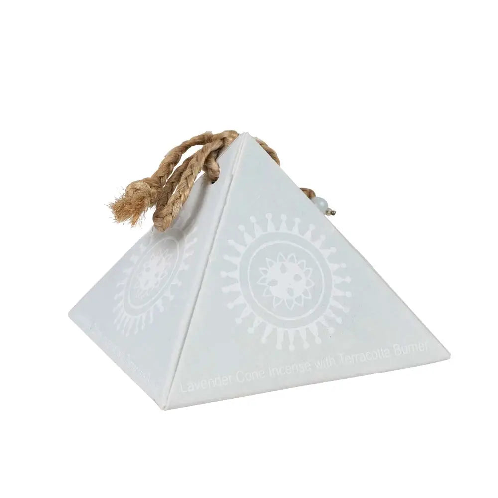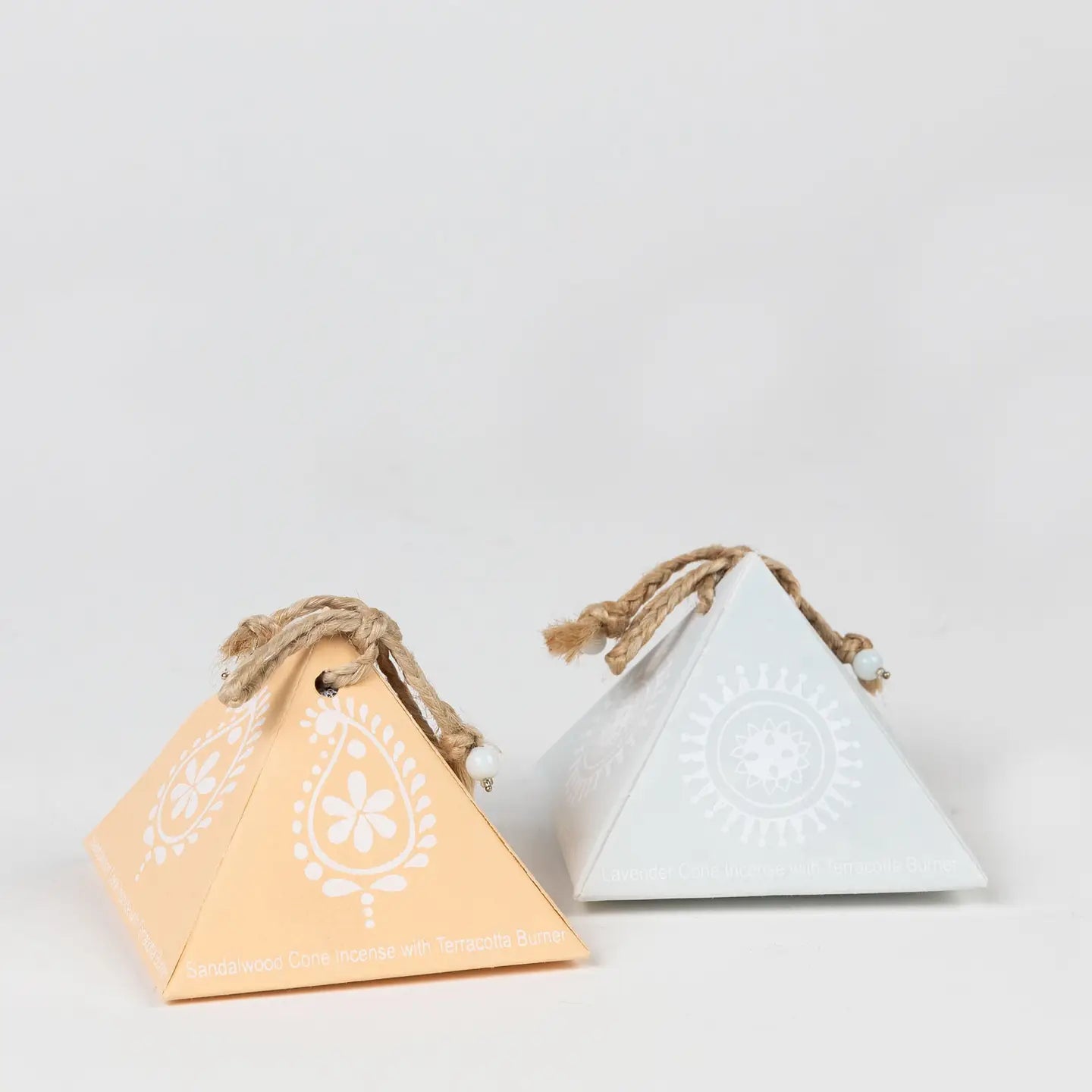 Enjoy the calming sensations from the sweet scent and aromatherapy of the Sandalwood Cone Incense Set made by artisans working with Silence in India. The set contains 10 lavender incense cones and a handcrafted terracotta incense burning plate, all in a mesh drawstring bag inside a paper pyramid box.