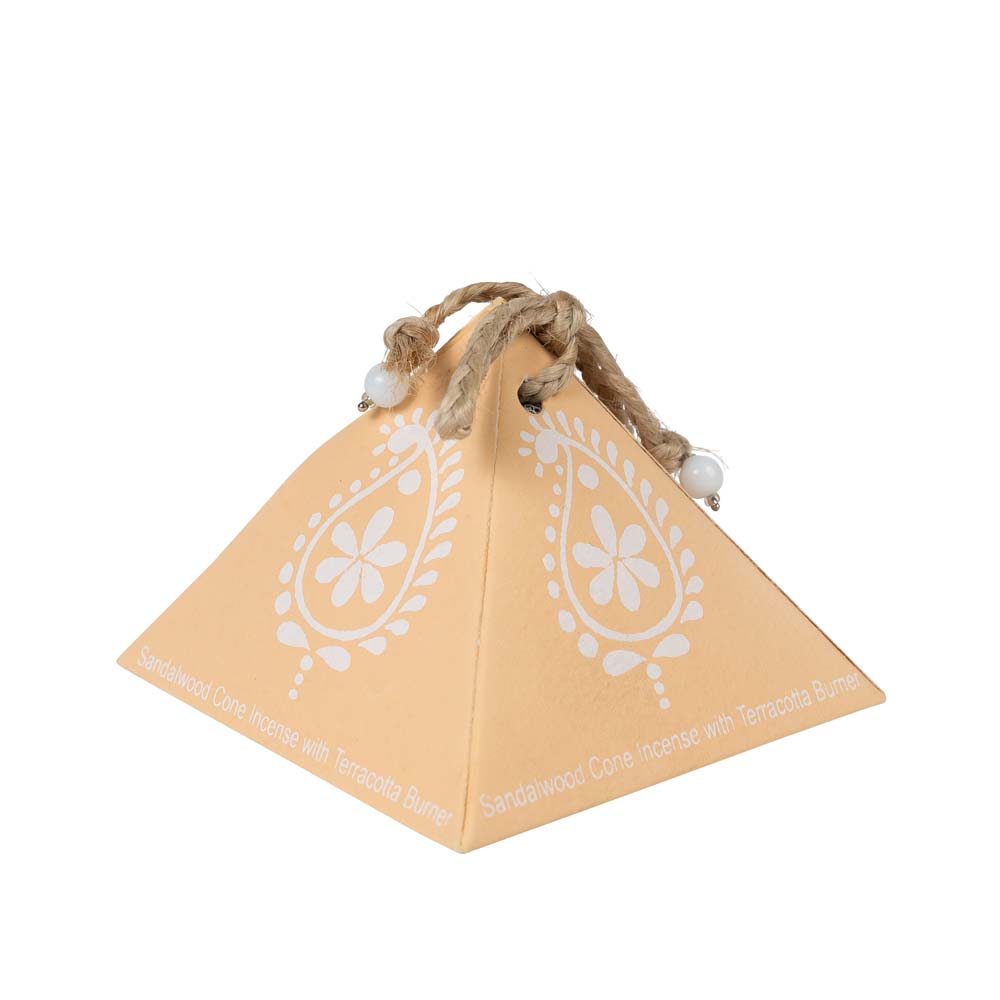 Enjoy the calming sensations from the sweet scent and aromatherapy of the Sandalwood Cone Incense Set made by artisans working with Silence in India. The set contains 10 sandalwood incense cones and a handcrafted terracotta incense burning plate, all in a mesh drawstring bag inside a paper pyramid box.