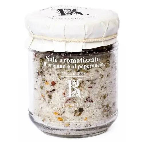 This all-natural sea salt is flavored with oregano and crushed red chili pepper from the volcanic island of Pantelleria. Try it on appetizers, pasta, vegetables, or meat.